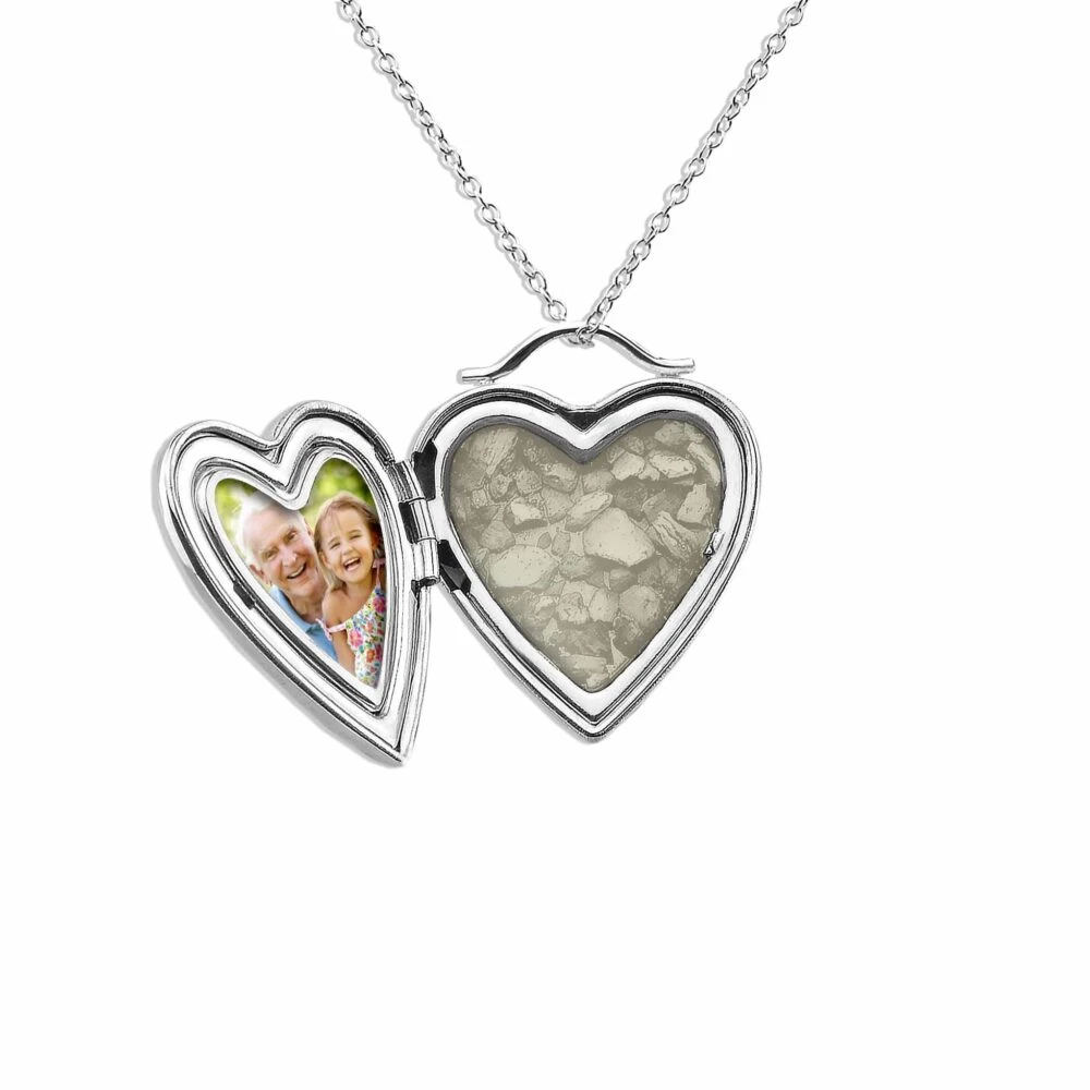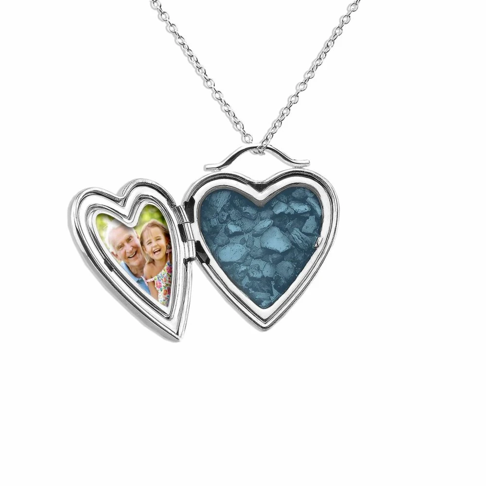 This polished Sterling Silver ladies heart-shaped locket bears a touching inscription “Always on my mind, forever in my heart” written in a flowing script. It opens to reveal a space for a photo and to mount the resin containing the cremation ashes. The resin comes in twelve colours and real diamond dust can be included. A one-gram cable chain supports the locket and a Rhodium plating prevents tarnishing. A presentation box is included.
