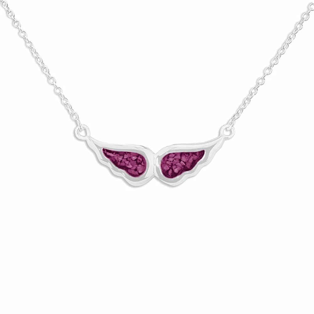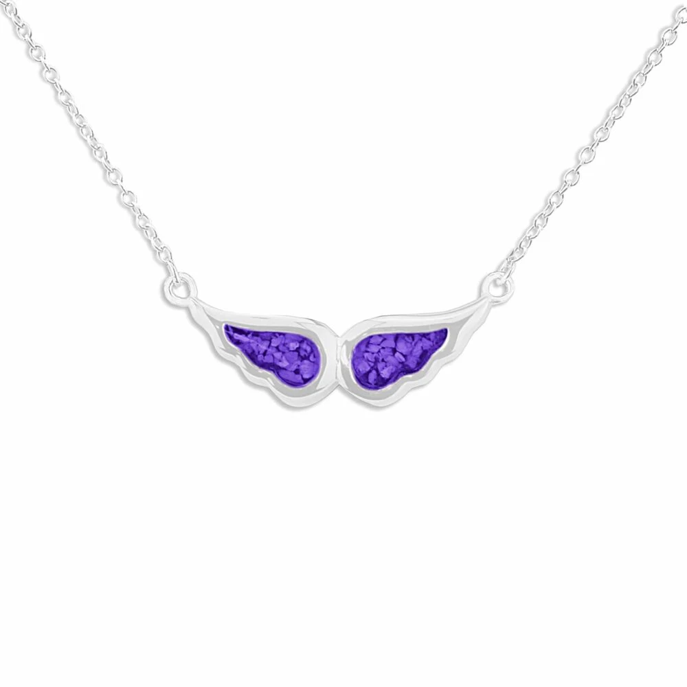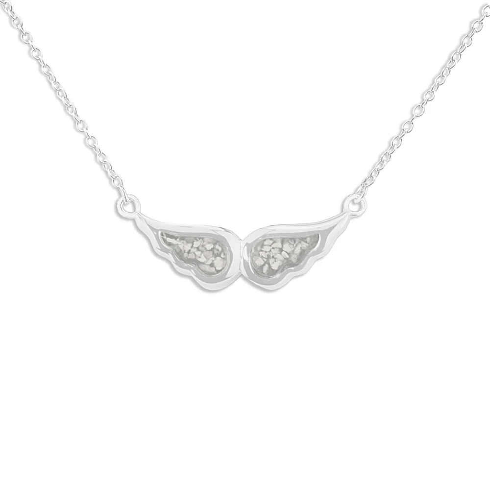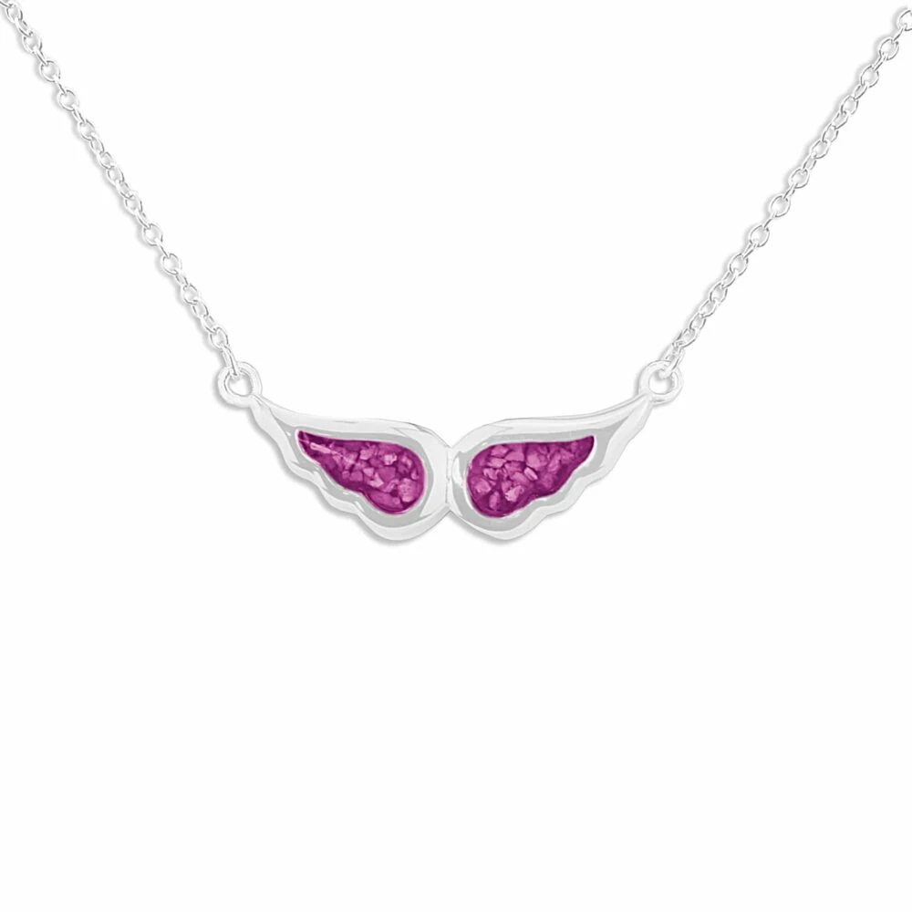 Our Angel Wings memorial necklace with fixed eighteen-inch chain and charm in the form of an angel’s wings. Each wing is a separate mount allowing the insertion of two distinct colours of resin and/or the inclusion of different remains. There is a choice of twelve resin colours and diamond dust can be included on request. It has a protective Rhodium plating and comes in a gift-wrapped box.