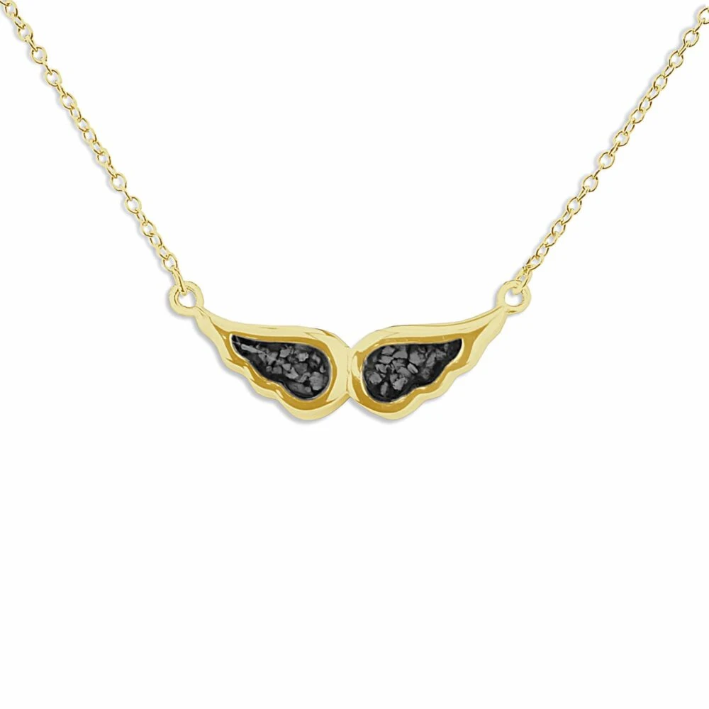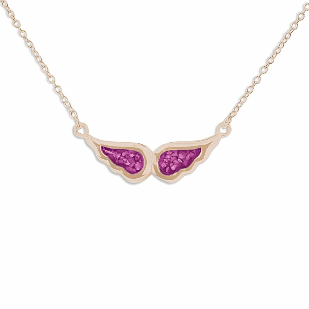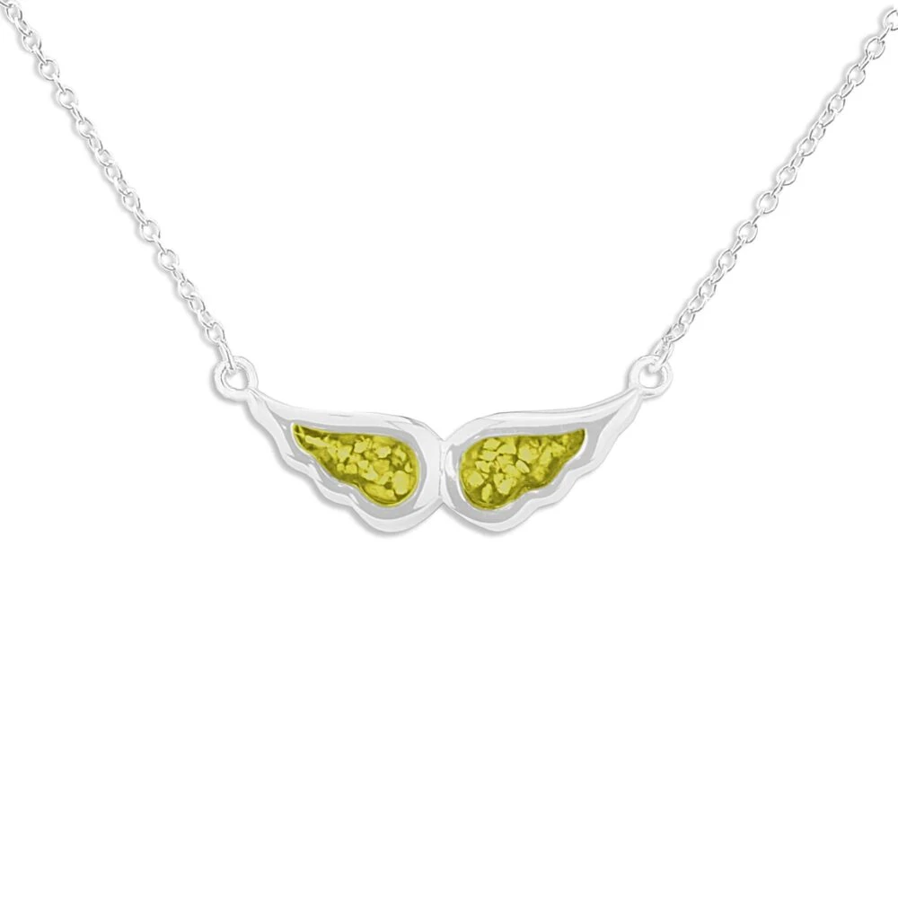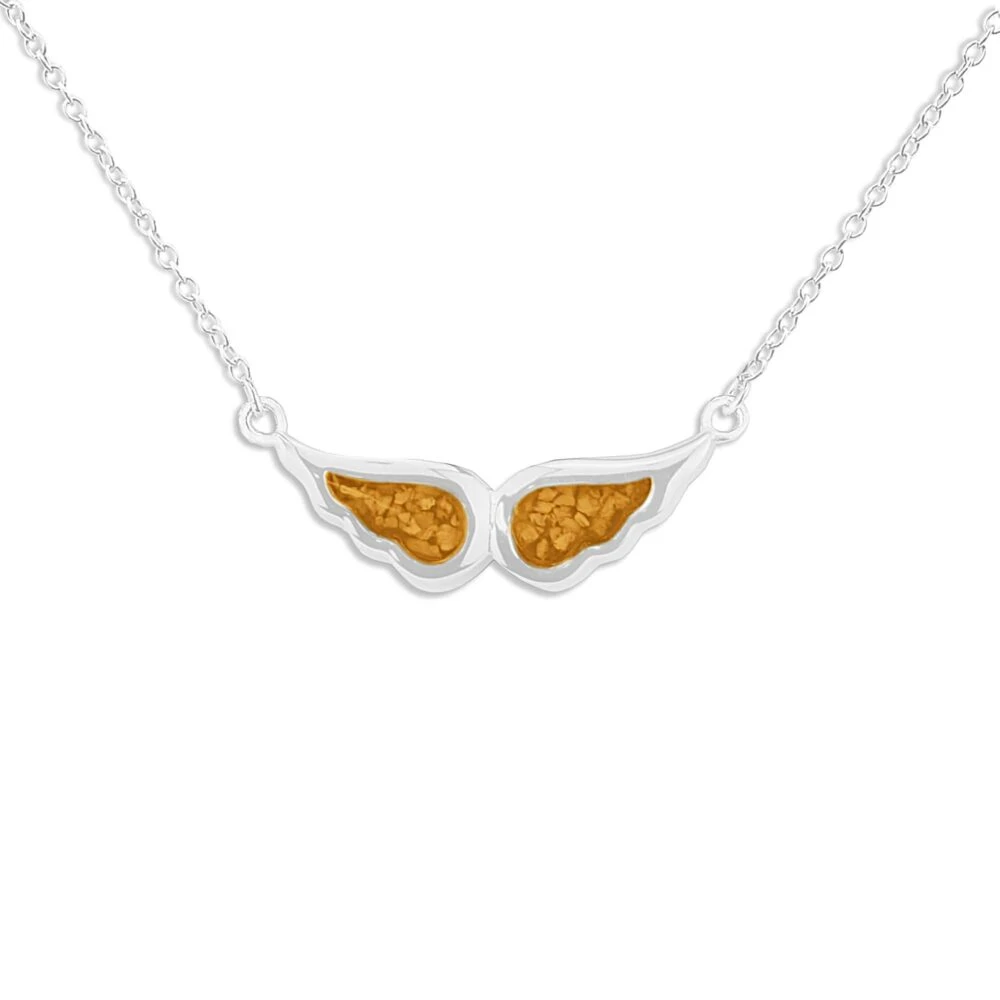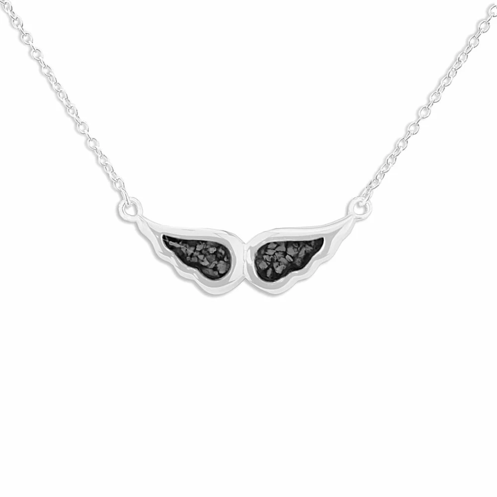 Our Angel Wings memorial necklace with fixed eighteen-inch chain and charm in the form of an angel’s wings. Each wing is a separate mount allowing the insertion of two distinct colours of resin and/or the inclusion of different remains. There is a choice of twelve resin colours and diamond dust can be included on request. It has a protective Rhodium plating and comes in a gift-wrapped box.