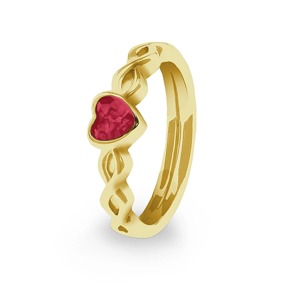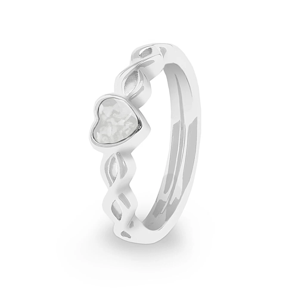 Our Beau memorial ring with heart shaped mount and delicately interlaced band. The special resin into which the cremation ashes will be mixed, comes in twelve different colours, and diamond dust can be included if requested. The ashes will be permanently sealed and visible within the resin. A Rhodium plating protects the ring from tarnishing and it comes in a gift-wrapped box.