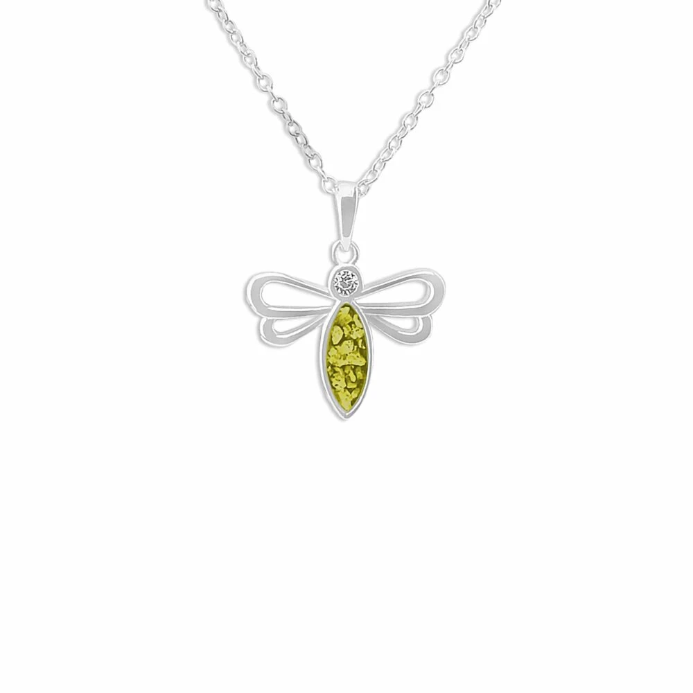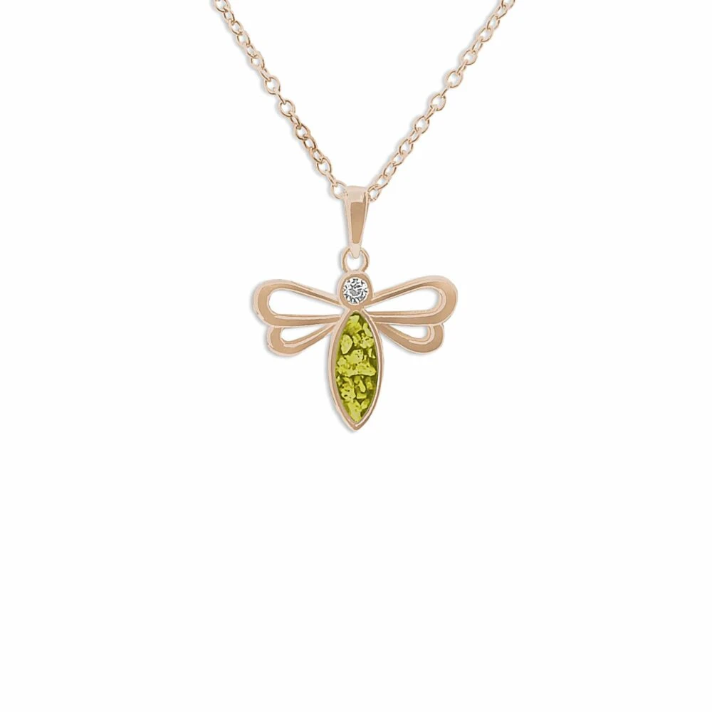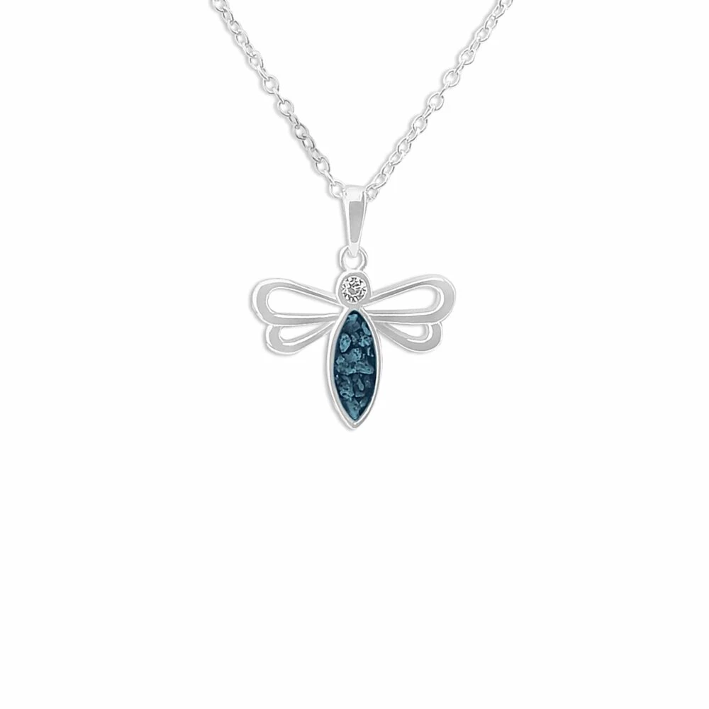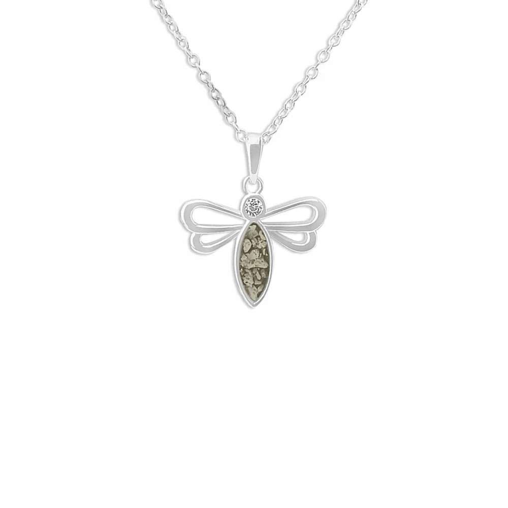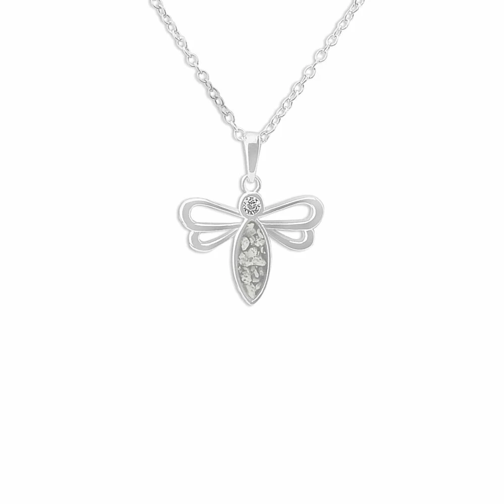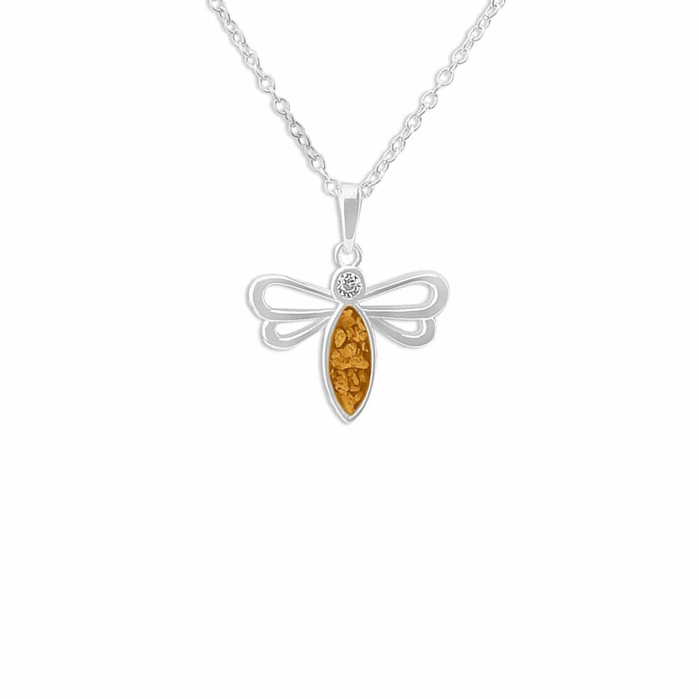 Our Bee pendant has a large elliptical mount for the resin containing the cremation ashes. It comes with an eighteen-inch chain and the 925 Sterling Silver is Rhodium plated for protection. 9k white, rose and yellow gold is available. The resin is available in twelve distinct shades and adding diamond dust to the mix is an option.