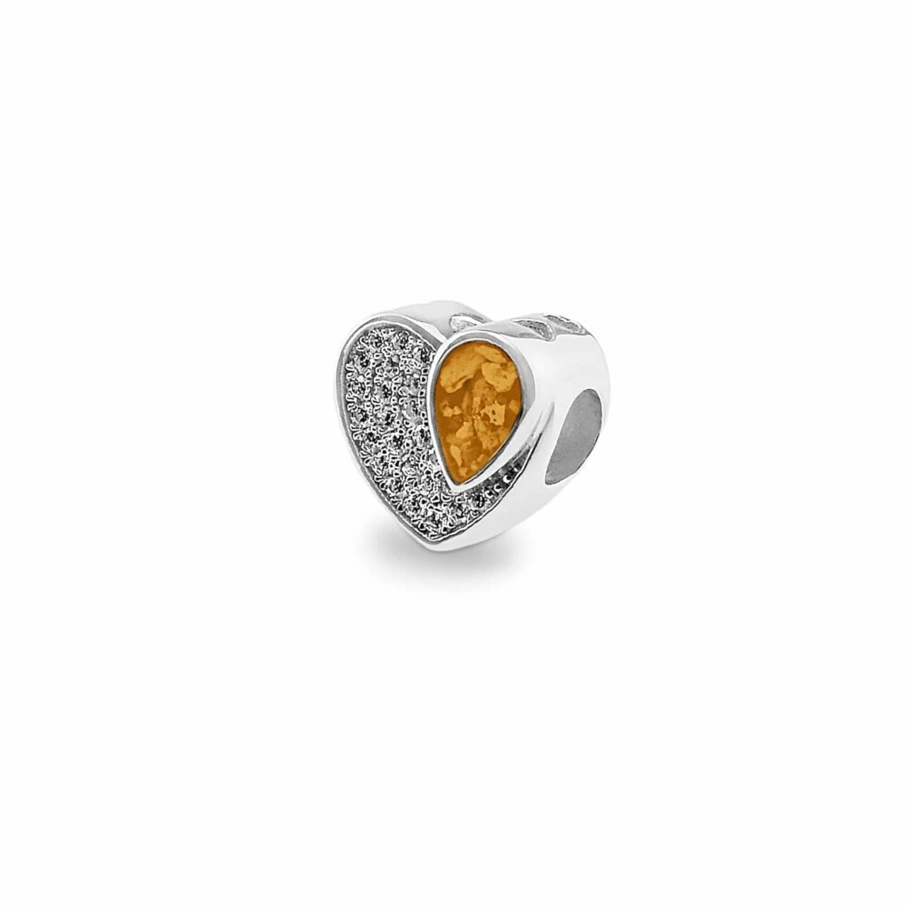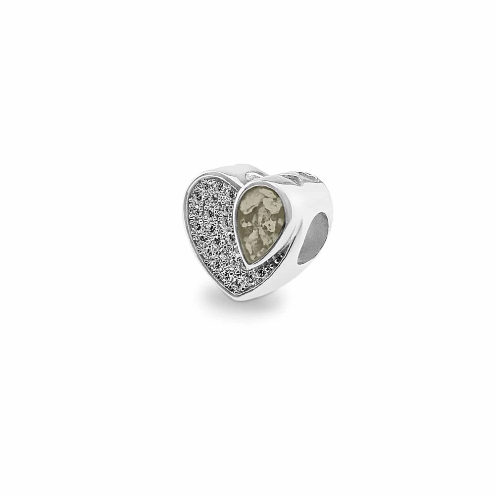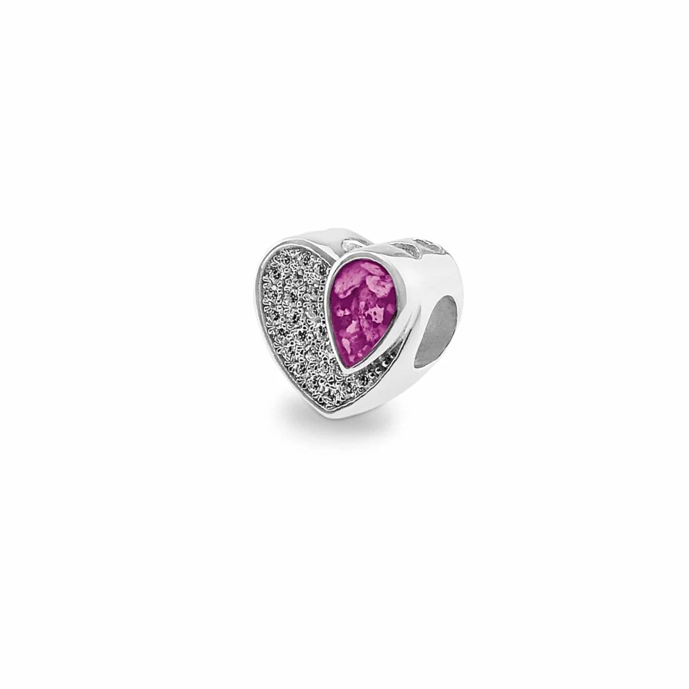 Our heart shaped Beloved charm bead in 925 Sterling Silver with a protective Rhodium plating to prevent tarnishing. The cremation ashes set in the resin are entered into a small mount within the heart. Twelve resin colours are available, and diamond dust can be added on request. The bead comes attached to a short ribbon in a gift box.