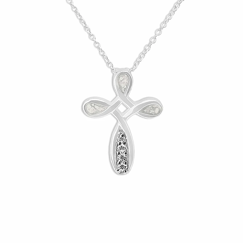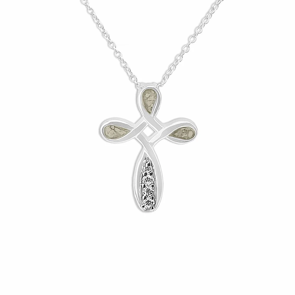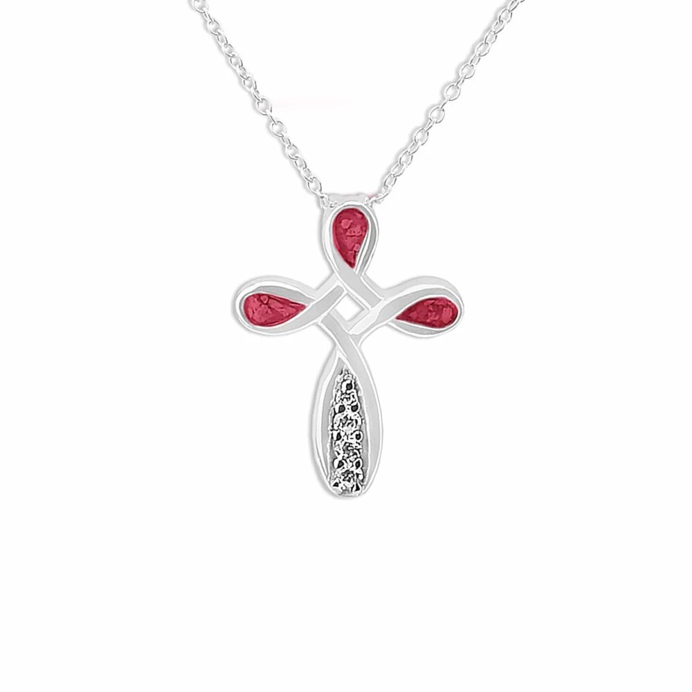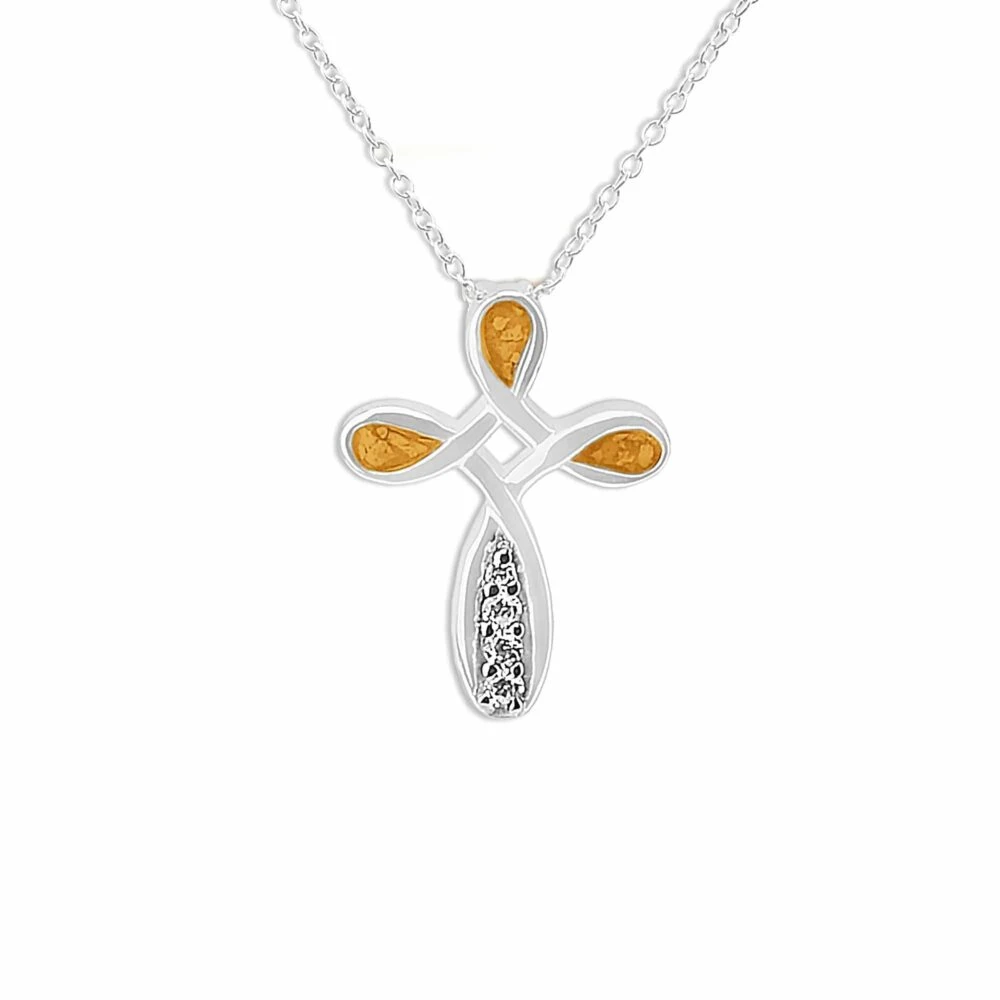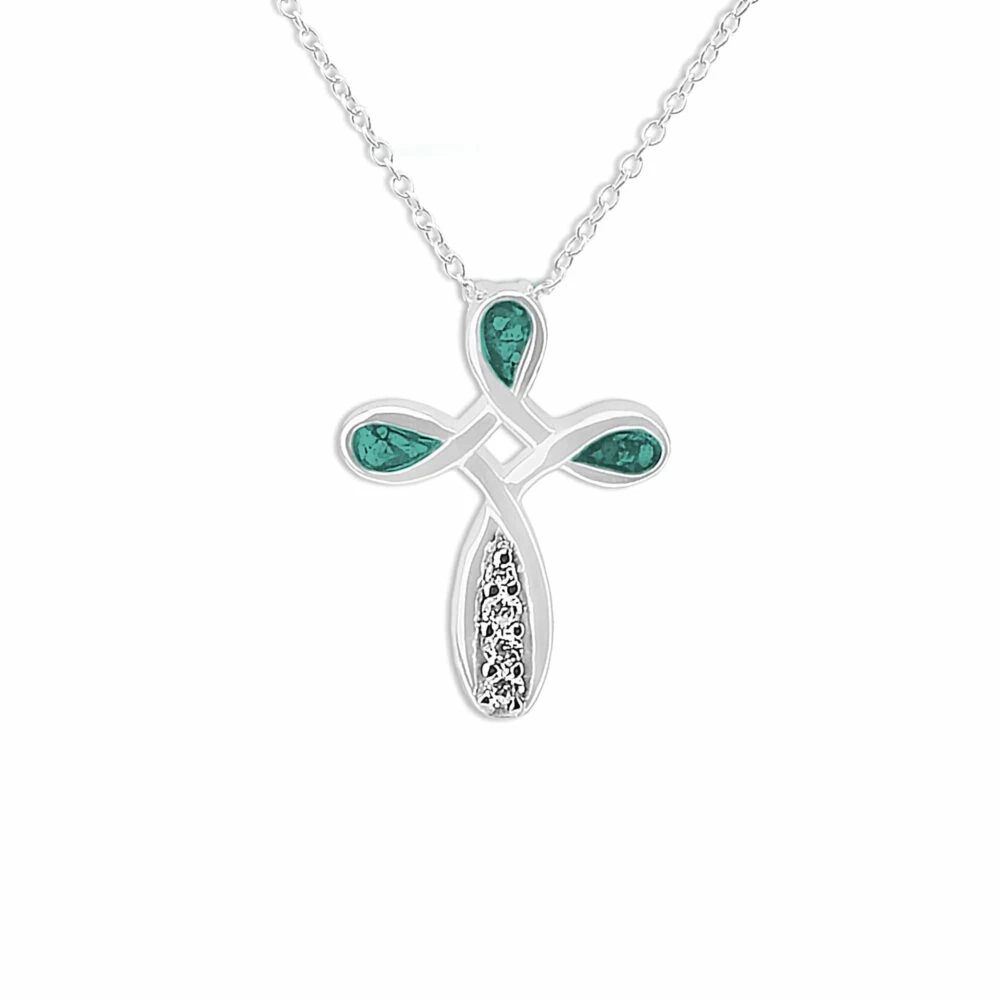 Our Celtic Cross pendant is available in Sterling Silver or 9k Gold. The three upper arms are mounts to hold the resin containing the cremated remains, and these can be distinct in each mount. Twelve resin colours are available and a diamond dust option. It comes with an eighteen-inch chain in a gift wrapped box.