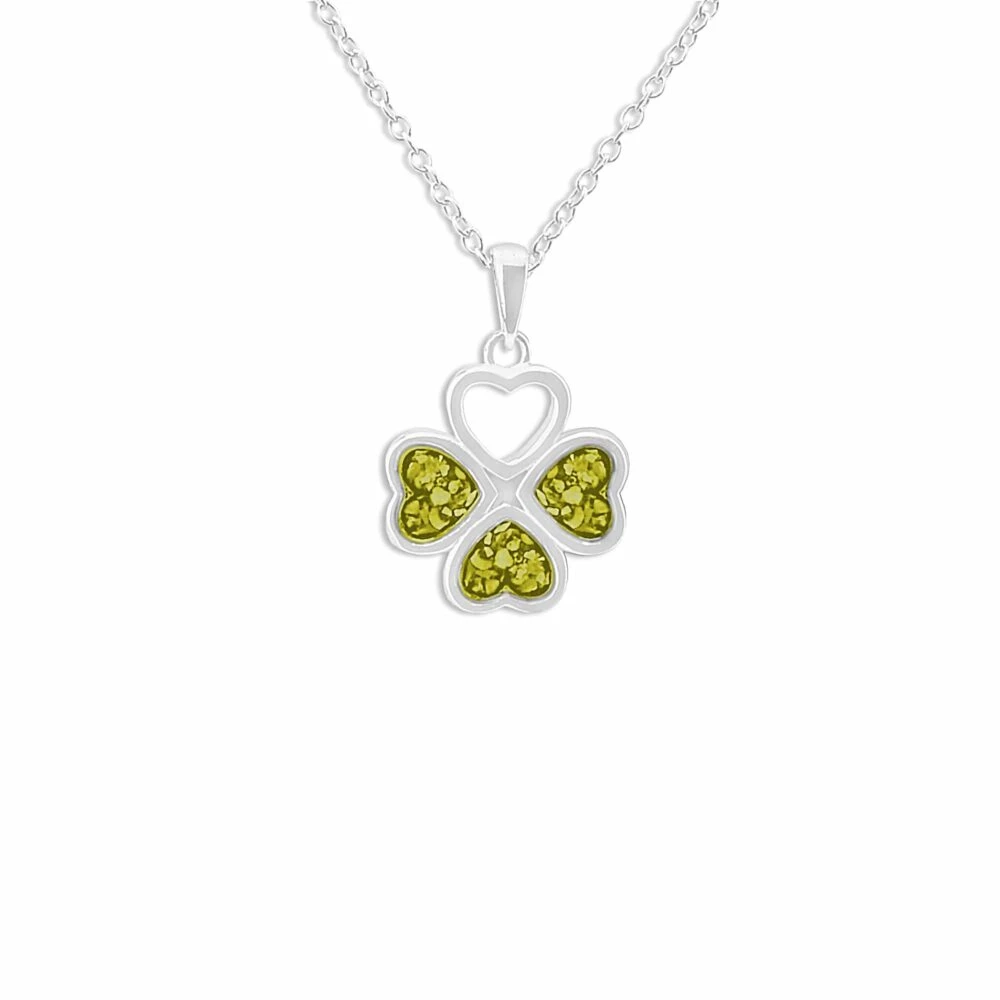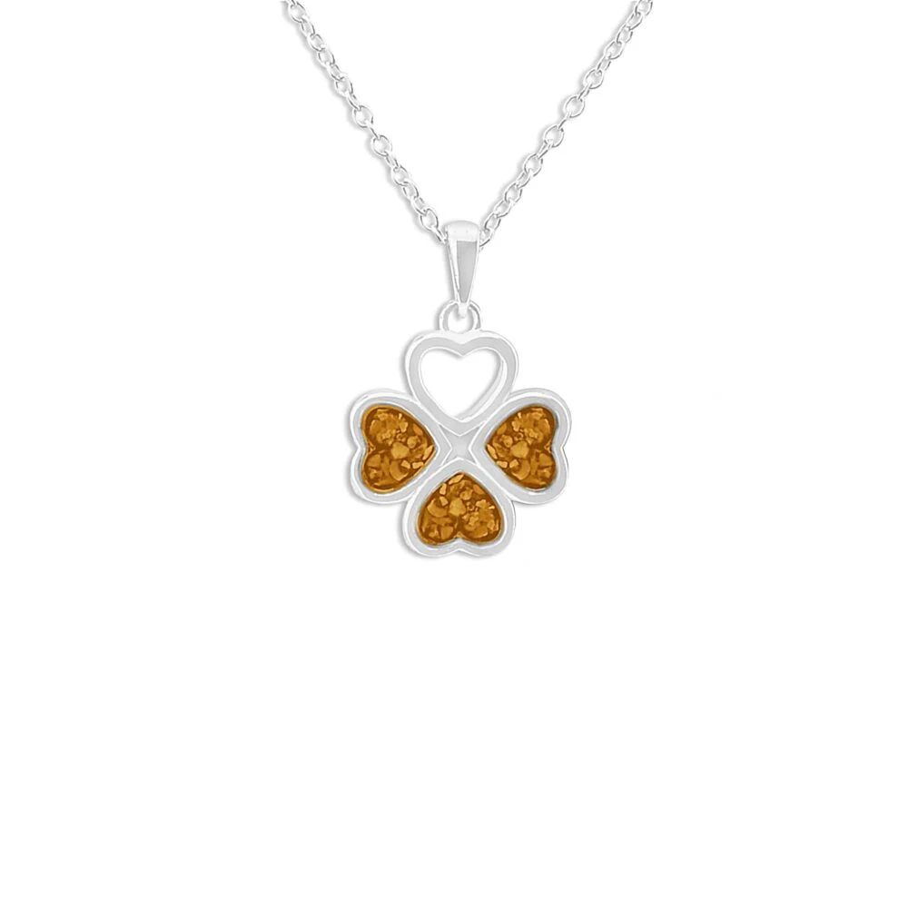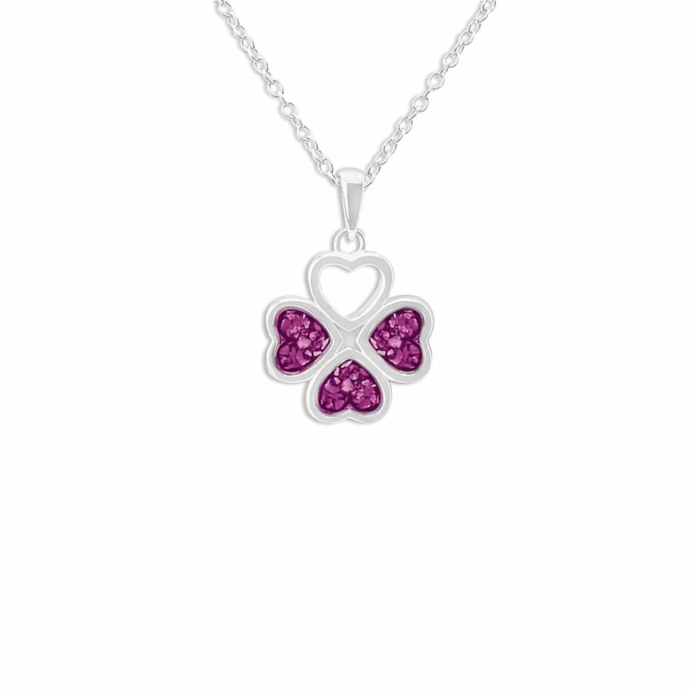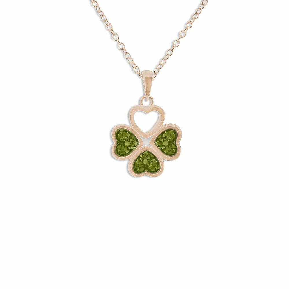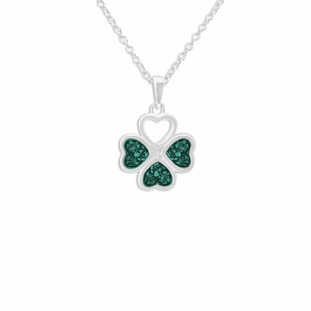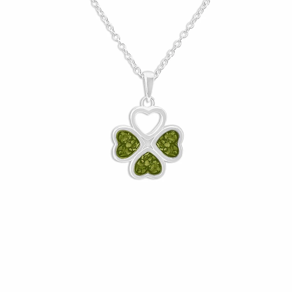 Our four-leaved Clover pendant with heart-shaped leaves. There are three separate mounts enabling the inclusion of distinct ashes in each one, and allowing unique colour combinations to be created from the twelve resin colours available. Diamond dust can also be added on request. Made from 925 Sterling Silver with a protective Rhodium plating or 9k white, rose or yellow gold. This memorial pendant comes in a gift-wrapped box.
