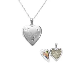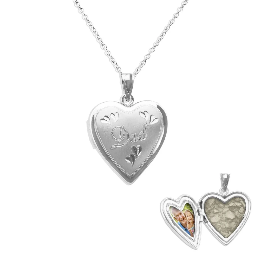 Sterling silver locket in the shape of a heart is engraved with the word “Dad”. It hangs on a swing bale from a cable chain and inside has space for a photo and the mount for the resin containing the cremation ashes. Twelve resin colours and a diamond dust option are available. The locket is hallmarked, has a Rhodium coating, and comes complete with a chain and presentation box.