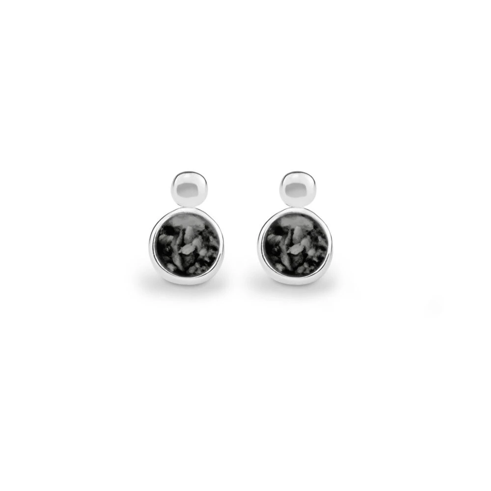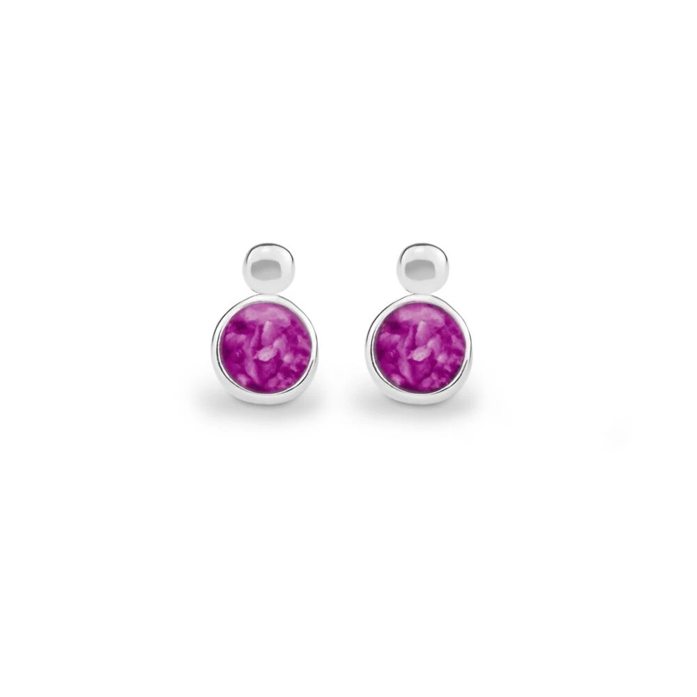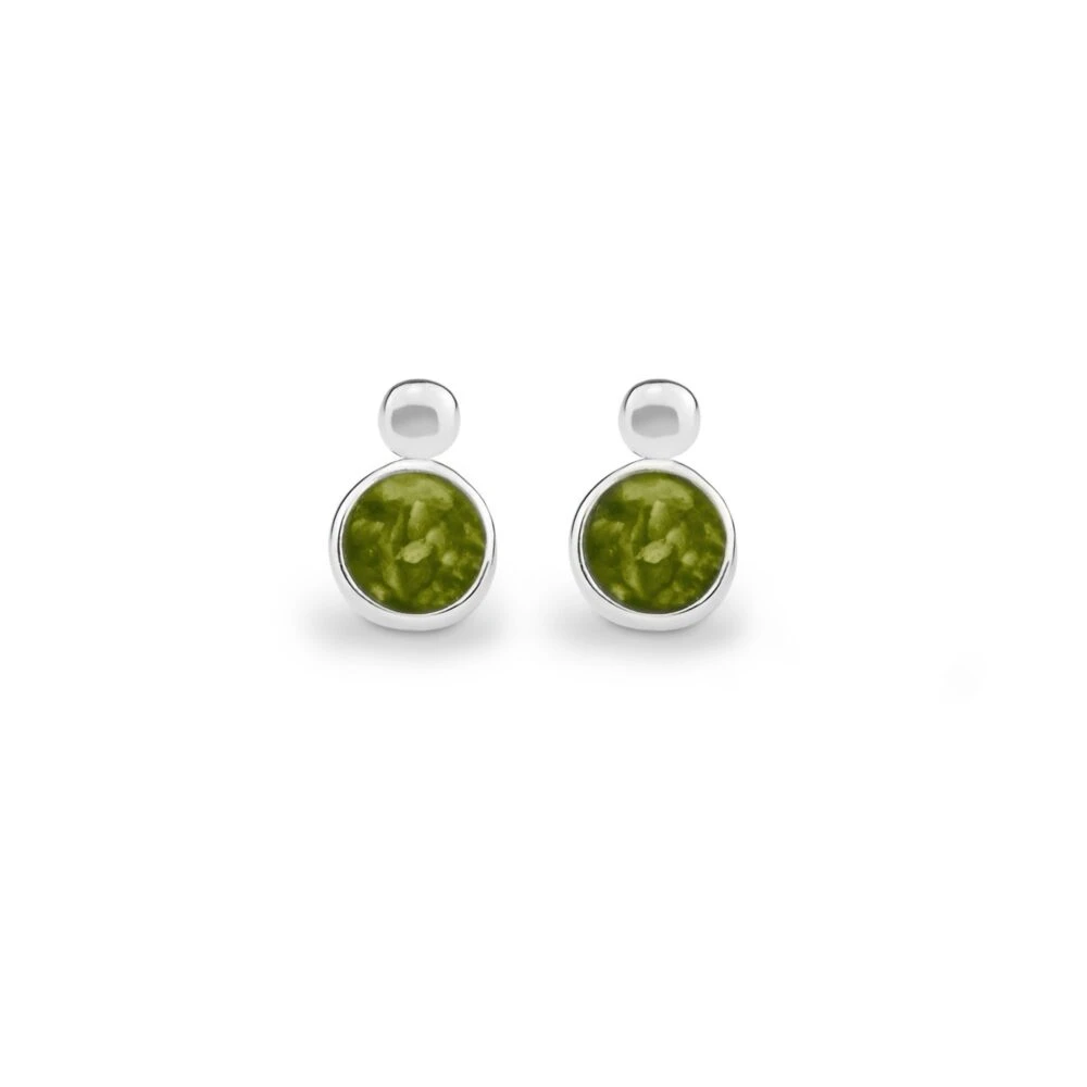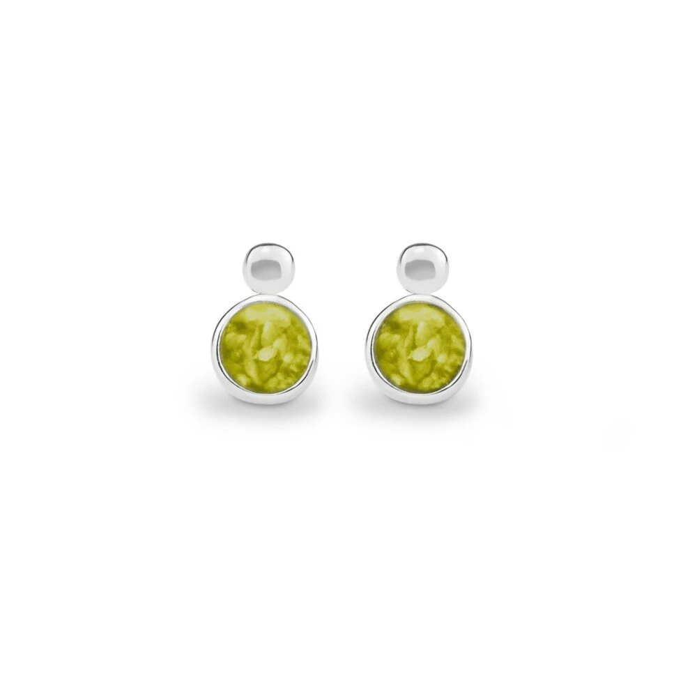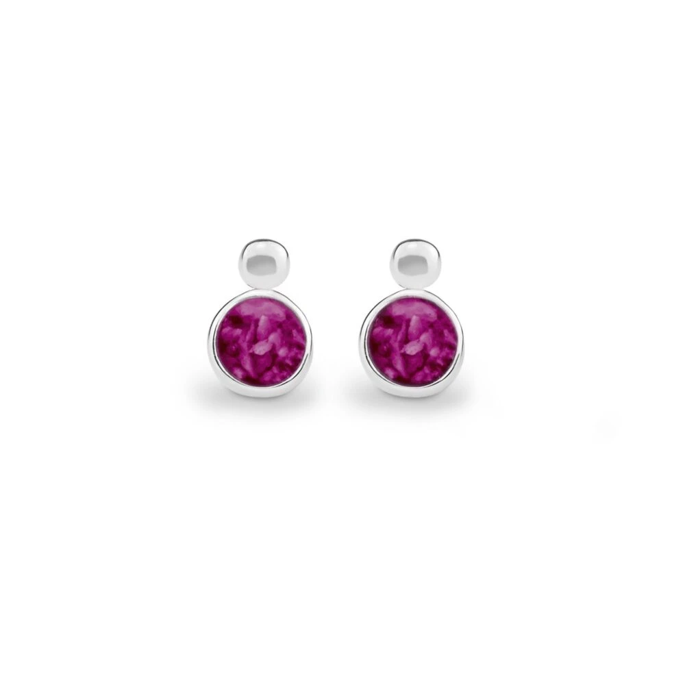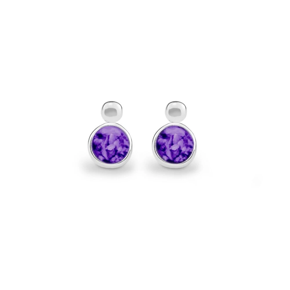 These Sterling Silver Delicate Drop Memorial Earrings have a circular mount for the coloured resin with the cremation ashes, which sits beneath a round ball that is attached to the post that passes through the earlobe and which is held in place with a small butterfly clip. The ashes are clearly visible in the resin in any of the twelve colours, and, for extra shine real diamond dust can be added to the mix. These 925 Sterling Silver earrings are Rhodium plated to prevent tarnishing. Also available in 9k white, rose and yellow gold.
