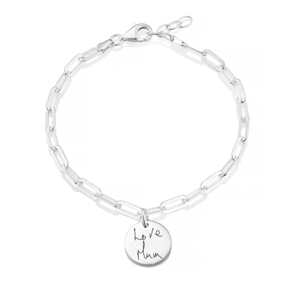 Indulge in the beauty and significance of our Sterling Silver Disc Oval Clasp Handwriting Bracelet. Embrace the fusion of sentiment and style, and cherish these personalised treasures forever.