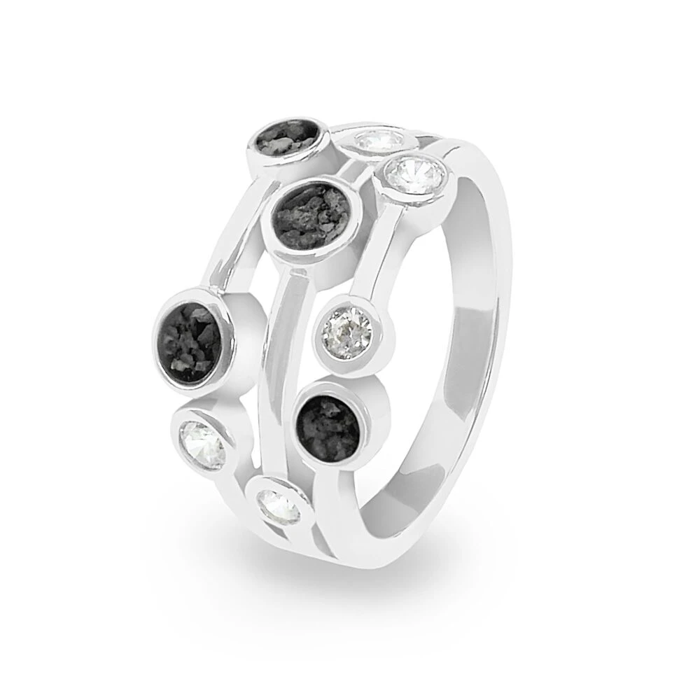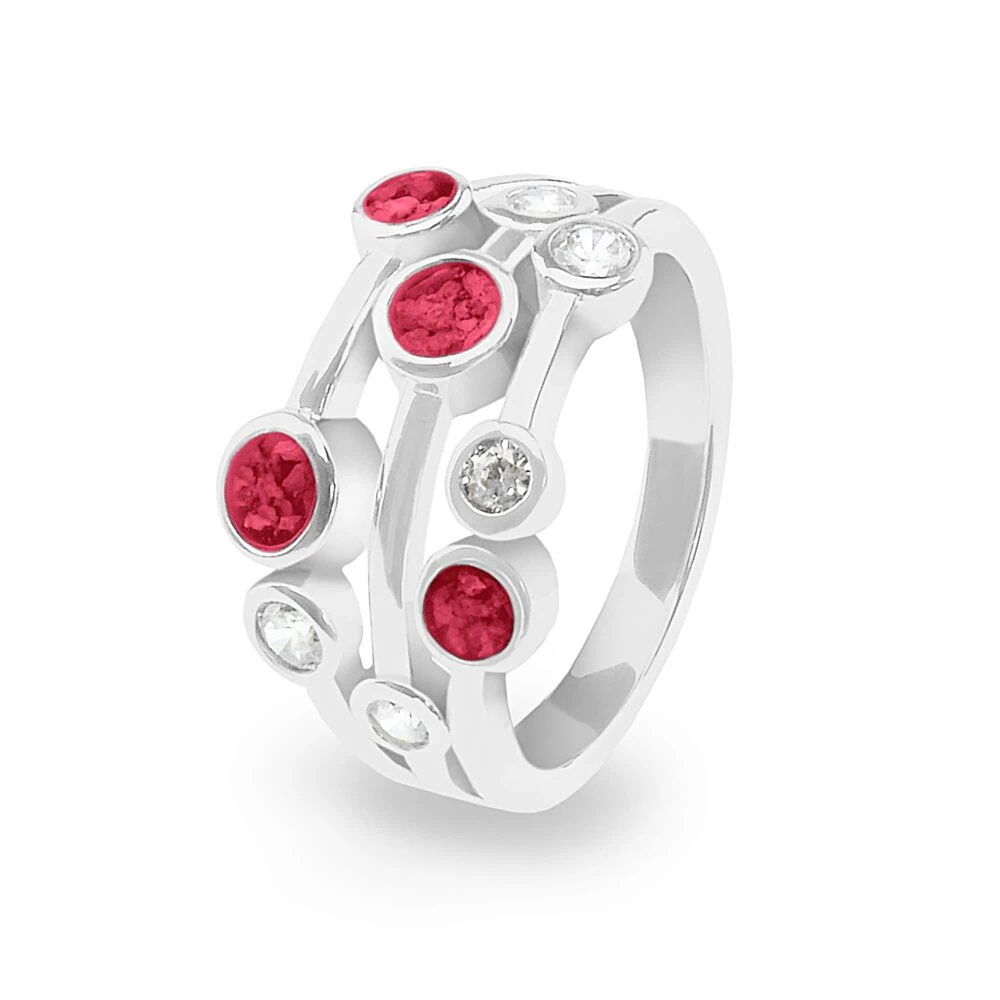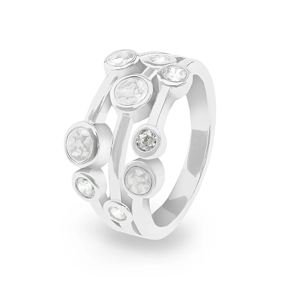 Ladies Droplets ring with Fine crystals and four circular mounts for the resin containing the cremation ashes. Up to four different resin colours, out of the twelve available, can be chosen, and different ashes can be incorporated into each mount. Diamond dust can be added by request, and the ring has a Rhodium plating to protect it. It comes in a small gift box.