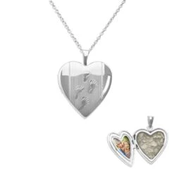 This hallmarked Sterling Silver ladies locket is etched with tiny footprints. It comes with a one-gram cable chain and hangs from a swing bale. The locket has a Rhodium plating and inside there is room for a photo and the resin with the cremation ashes. The resin comes in twelve different colours and real diamond dust can be added if requested. It comes in a presentation box.