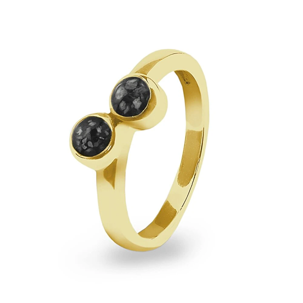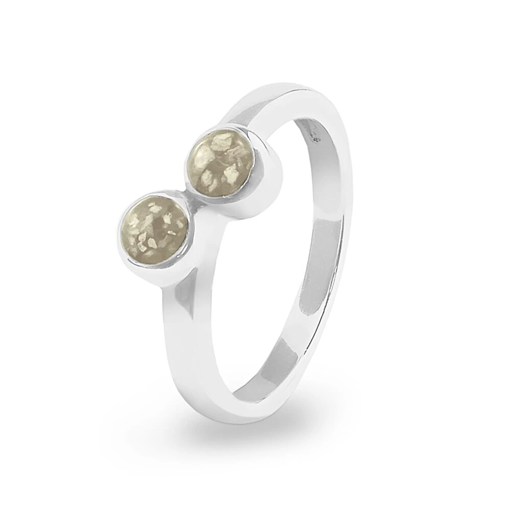 This ladies Inspire ring has two small circular mounts that can hold one or two colours of resin, and different cremation ashes can be mounted in each if desired. Diamond dust can be added to the mix on request. This ring is available in either 925 Sterling Silver or 9k gold. It comes in a small gift-wrapped box.