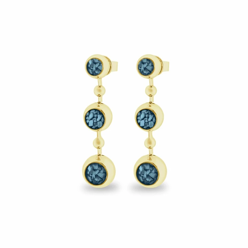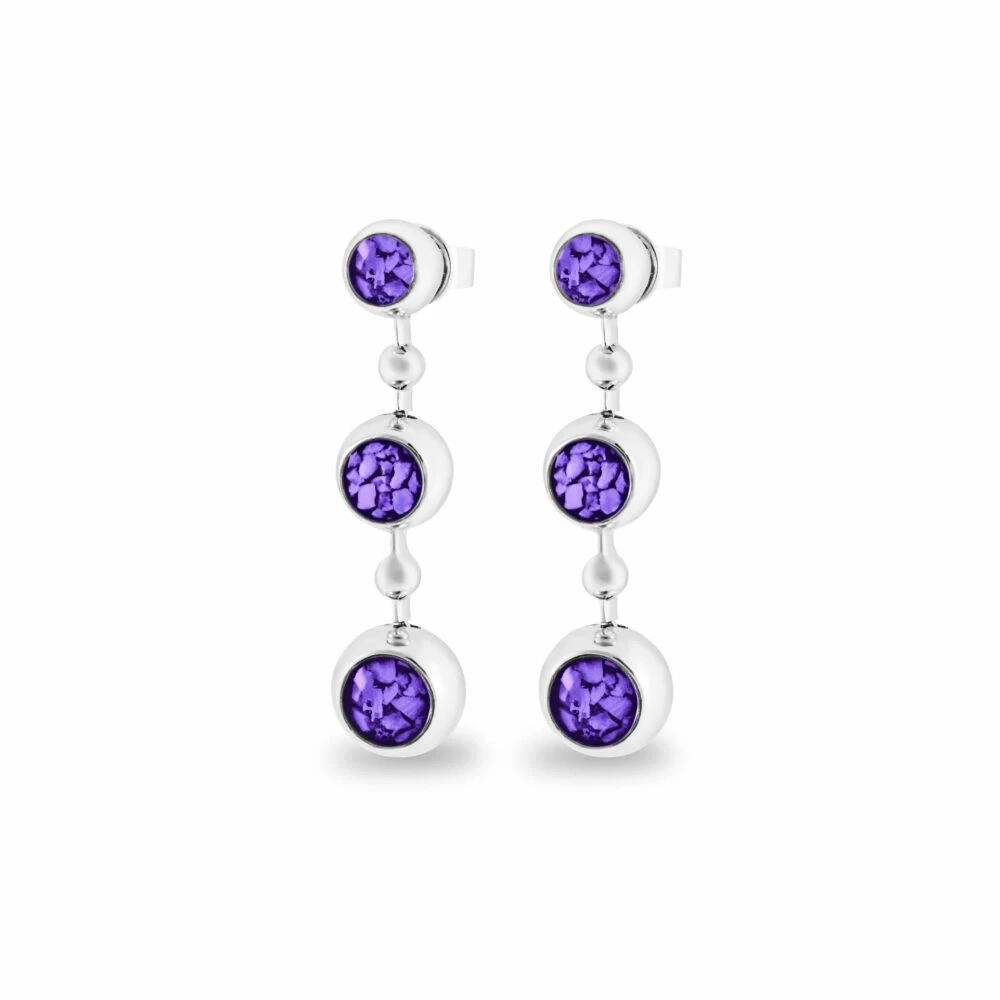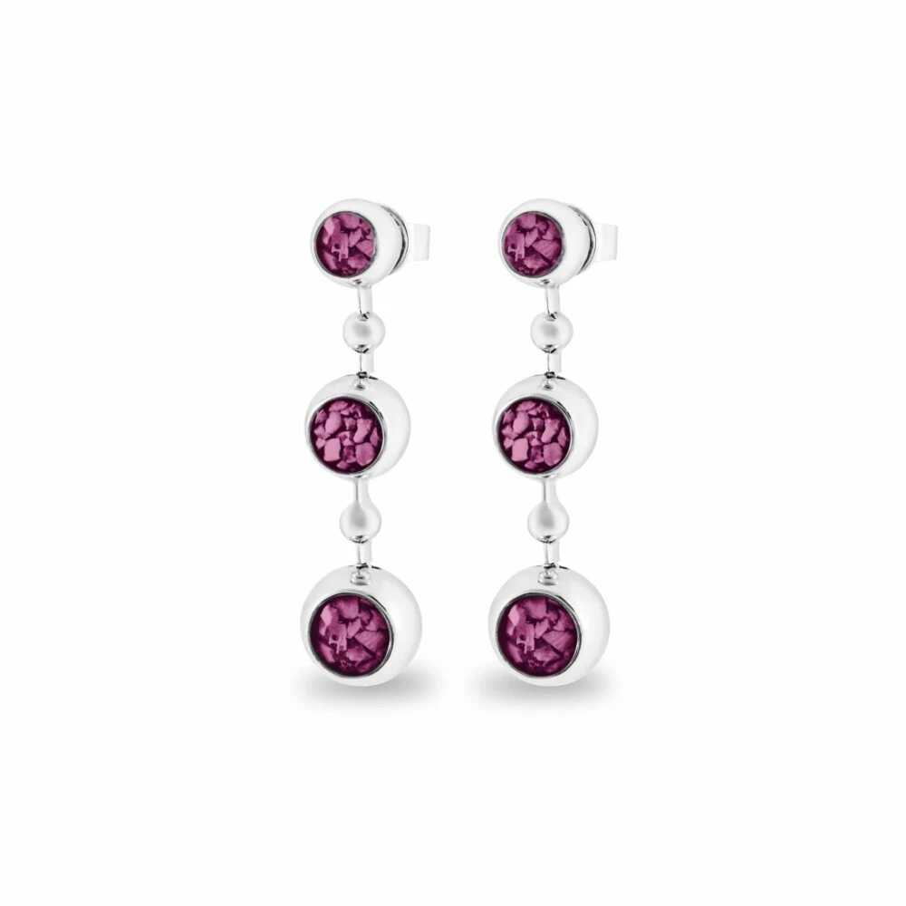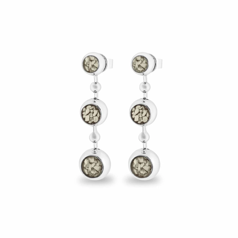 The Rondure Triple Drop earrings come in hallmarked 925 Sterling Silver with a protective Rhodium plating or by special order in Rose, Yellow, or White Gold. They have three small circular mounts hanging vertically and a different colour of resin and /or different ashes can be used in each mount. Diamond dust can be added on request and the earrings come in a presentation box.