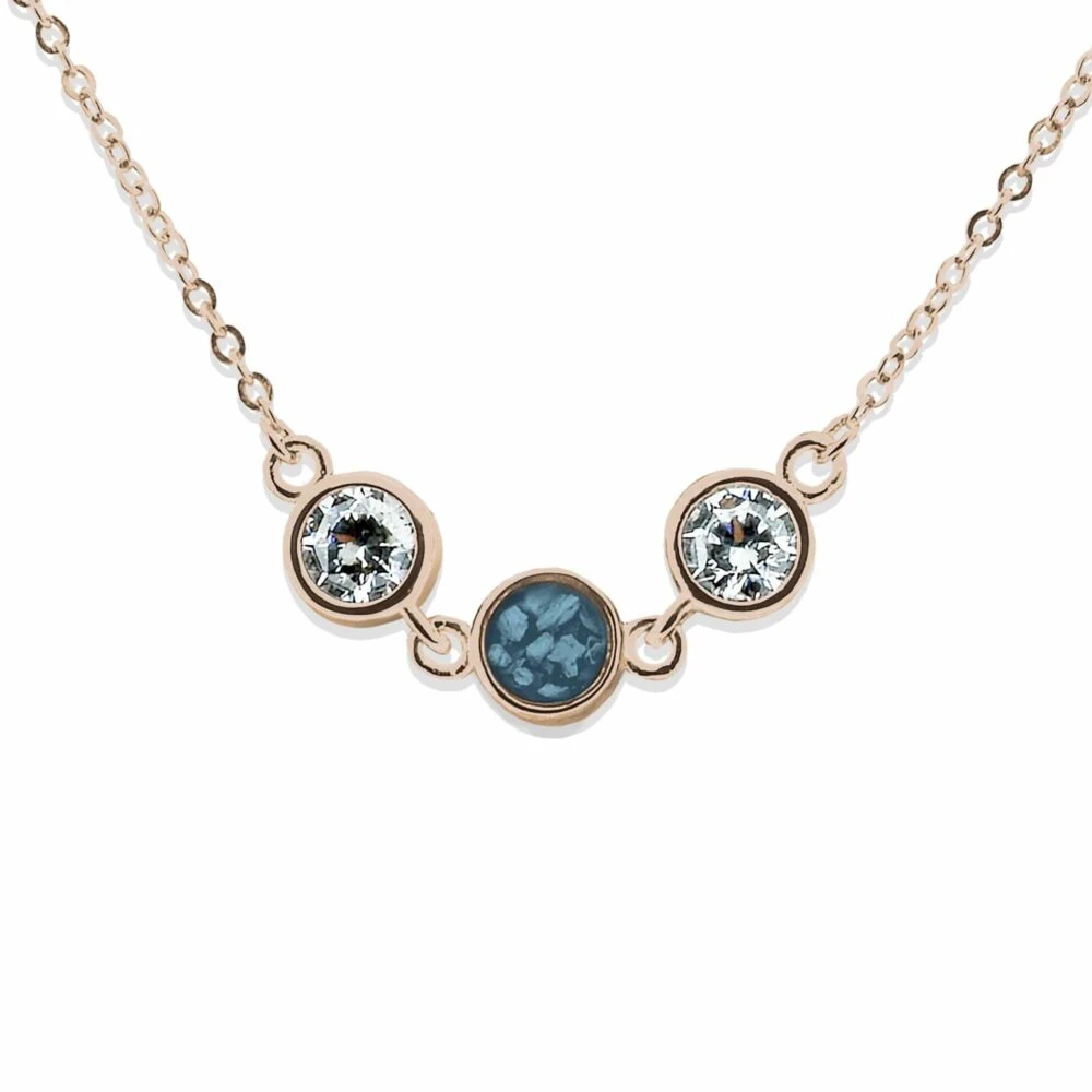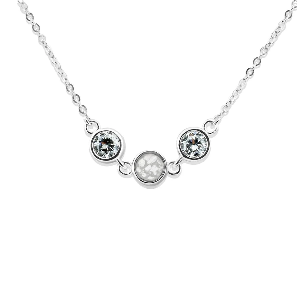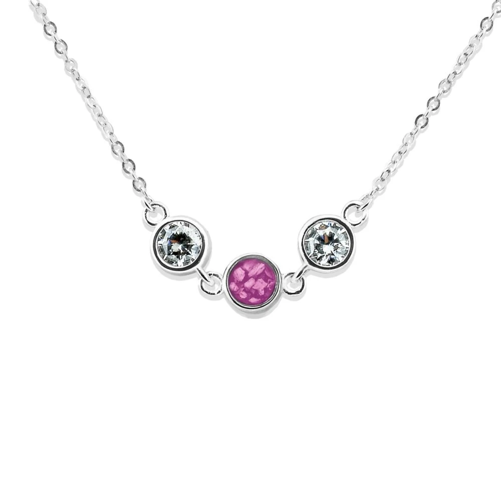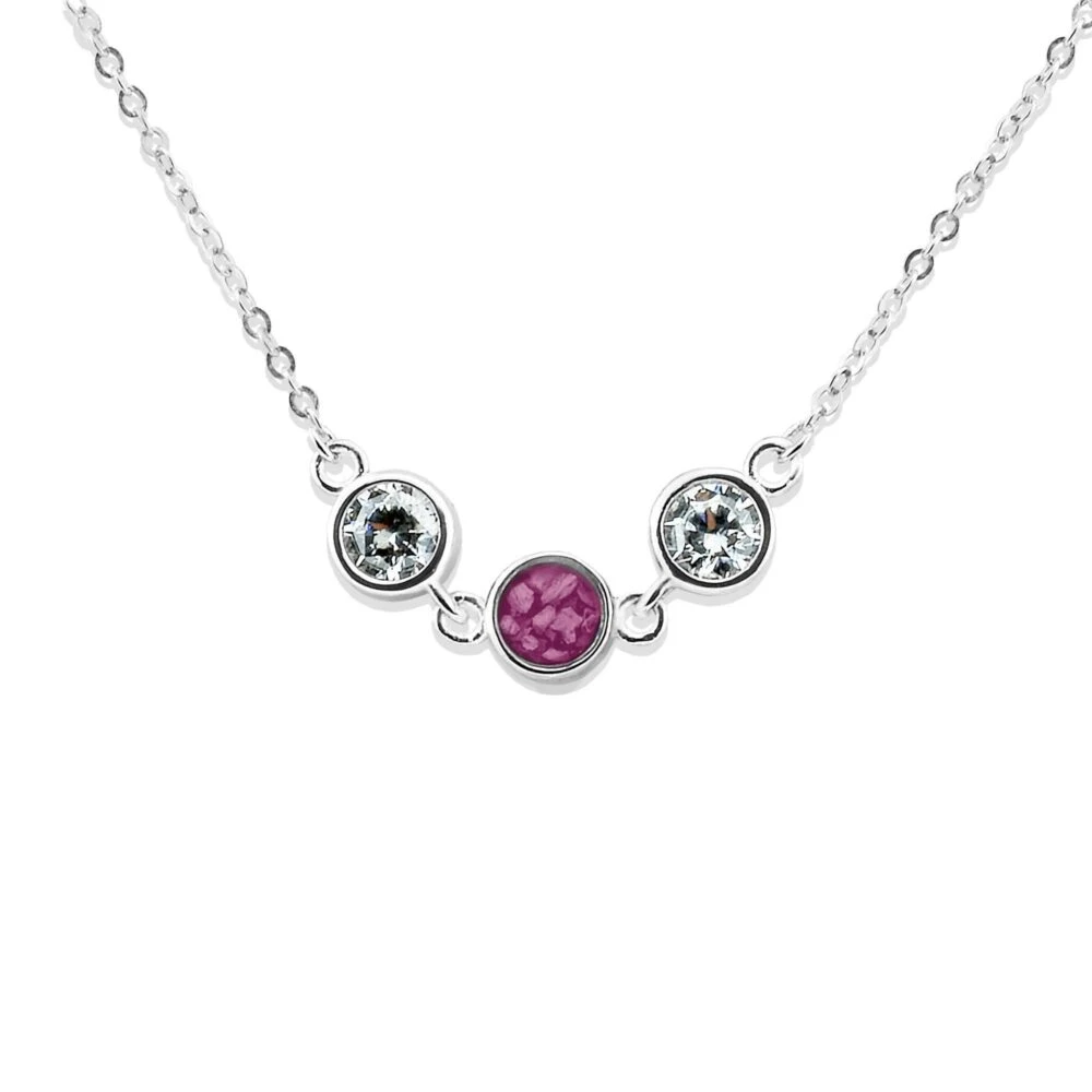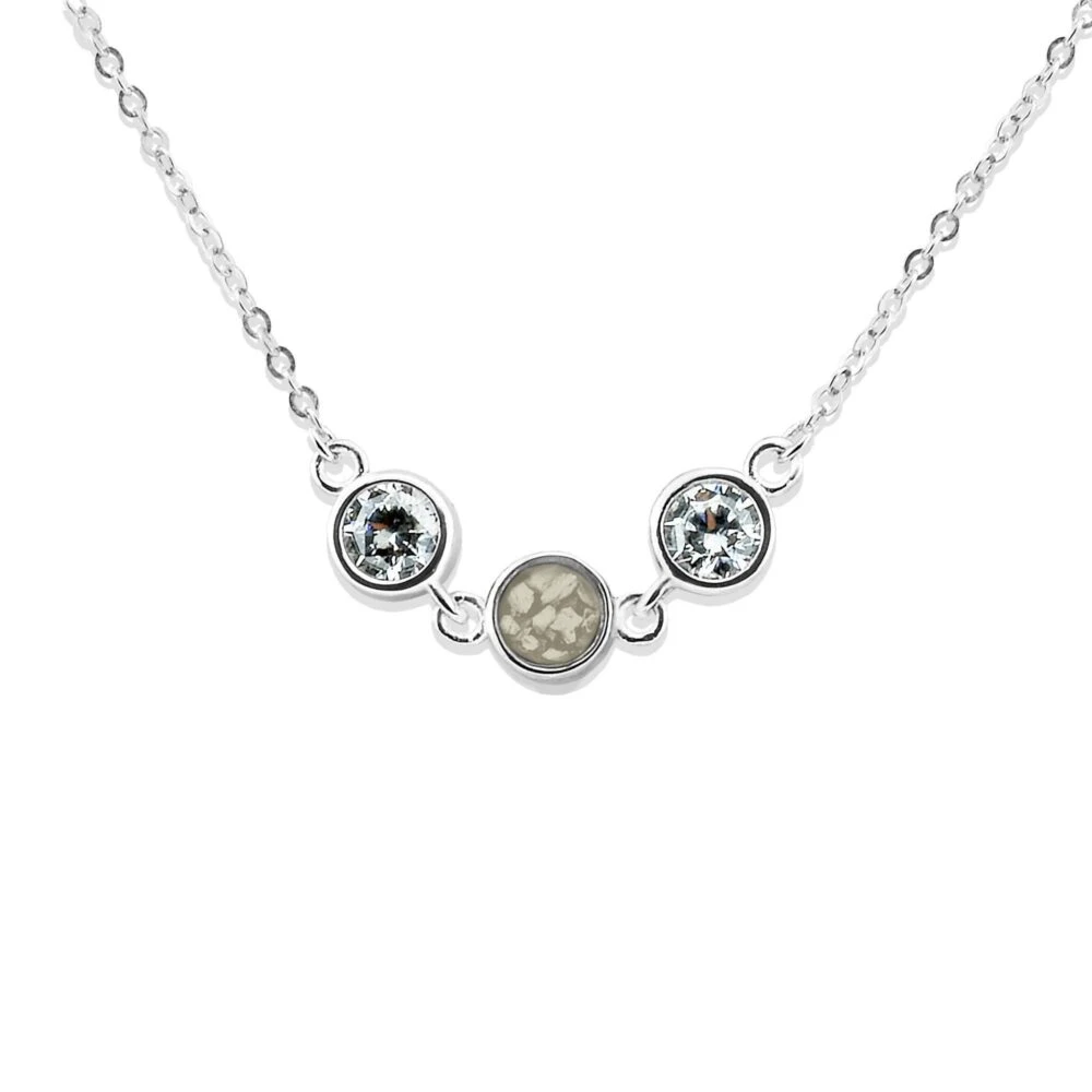 This Sterling Silver Three of Us Memorial Necklace has a small central circular mount where the coloured resin containing the cremation ashes and the optional diamond dust is set. This is attached to two more small circular mounts each one containing a large Fine Crystal. An adjustable 45-cm 925 Sterling Silver chain is permanently attached to these.