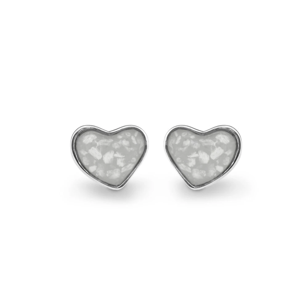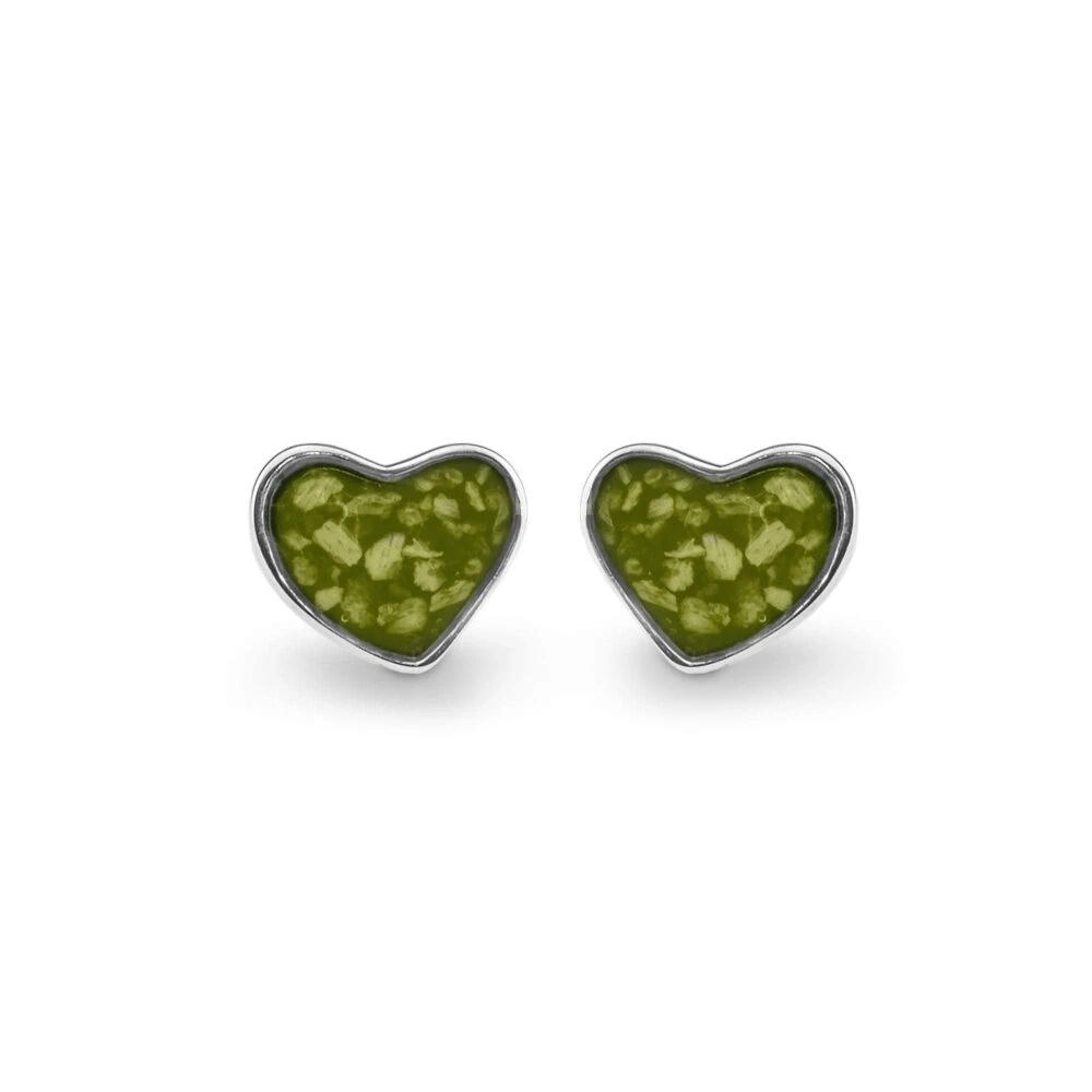 Our Sterling Silver Ashes Memorial Earrings are in the form of a heart and are a stud earring style. The heart-shaped mount, post and rear butterfly clip are available in 925 Sterling silver with a Rhodium plating to prevent tarnishing and also 9k gold variations.