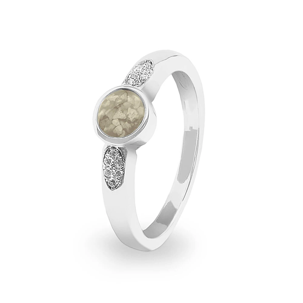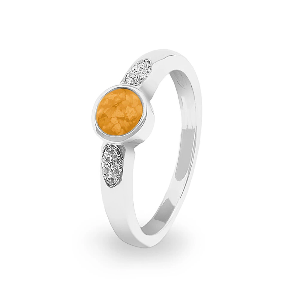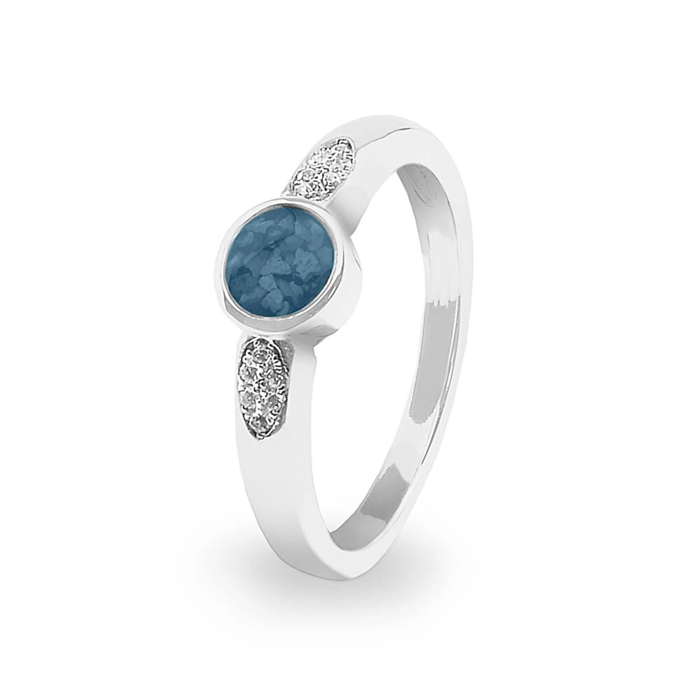 Our special memorial ring with simple circular mount to hold the resin containing the cremated remains suspended within it, is adorned on either side with small Fine crystals set into the band in an ellipse form.