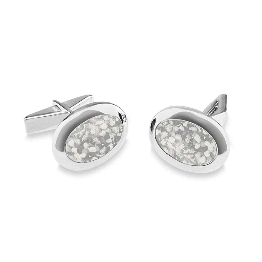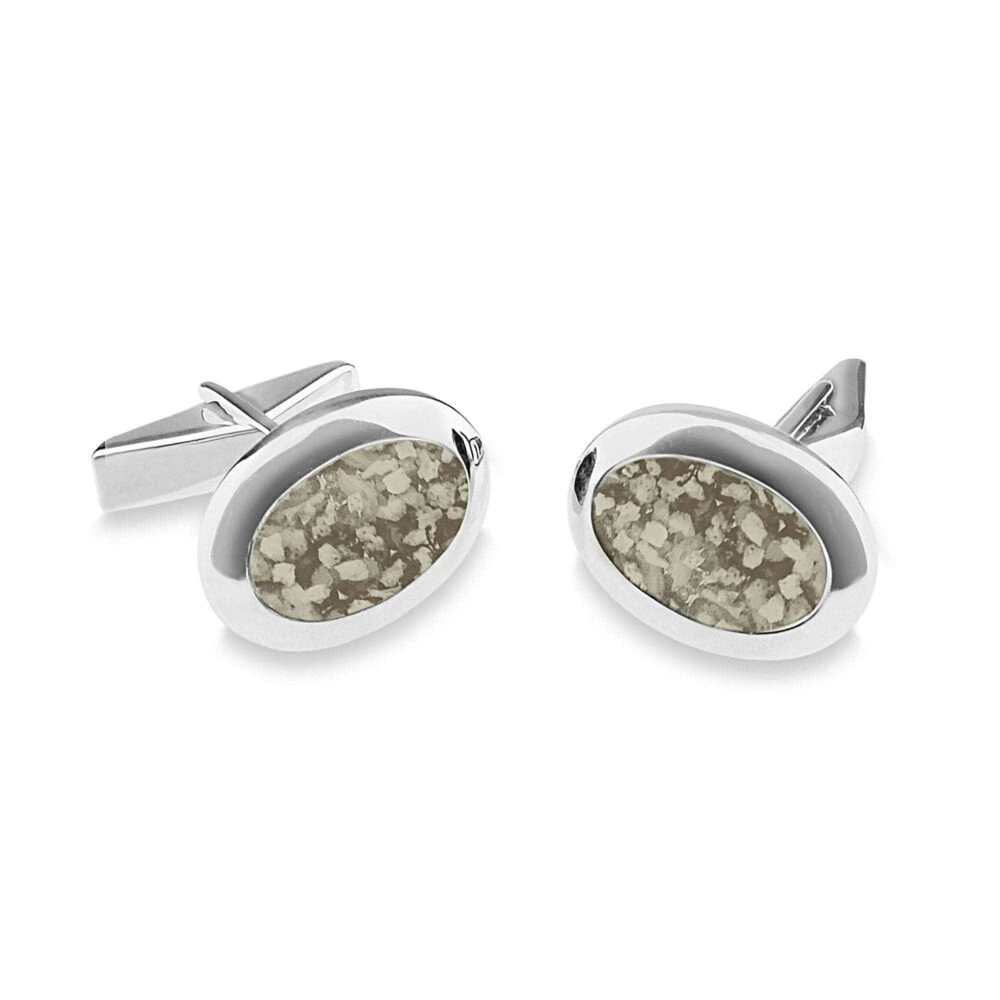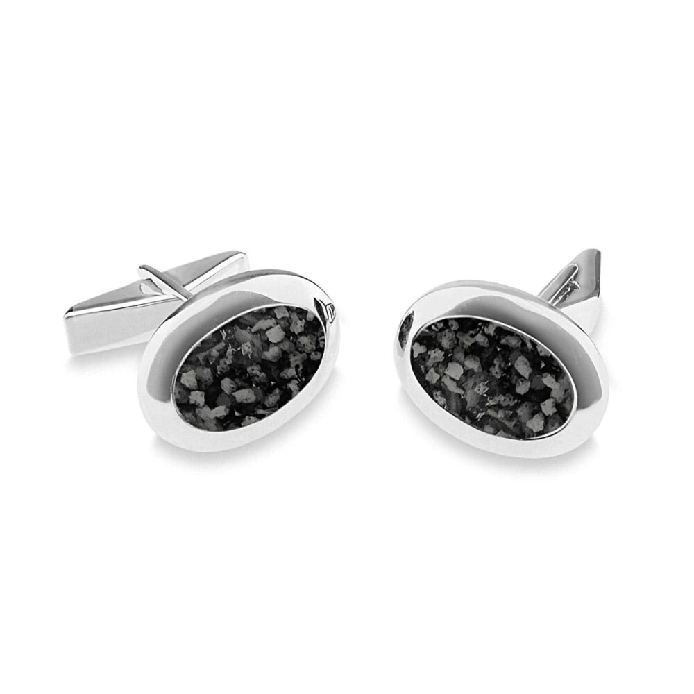 Our men’s cuff links are finely crafted from sterling silver and on the face, an oval mount holds the resin containing the cremation ashes. They have a sturdy post and a safety back for security. Twelve different resin colours are available and there is also the option of adding a pinch of diamond dust for added sparkle. A Rhodium plating prevents tarnishing.