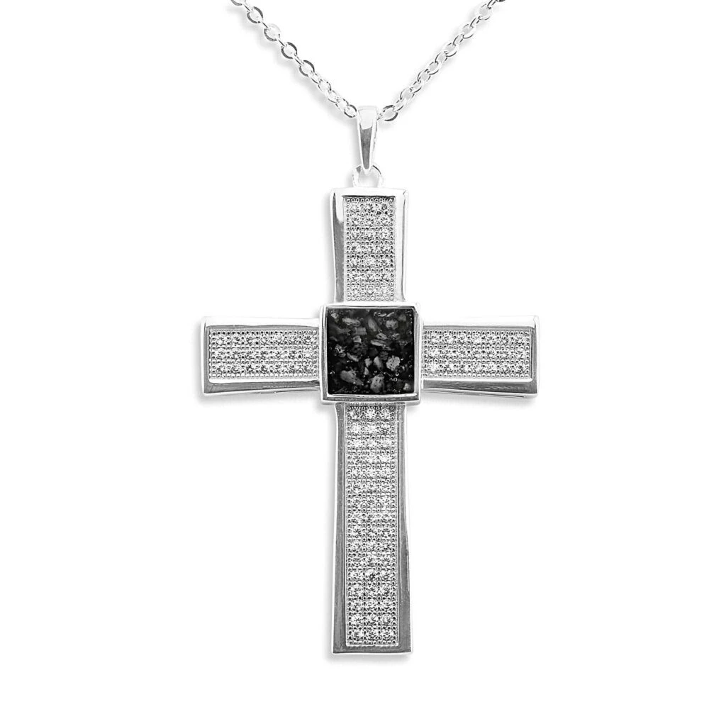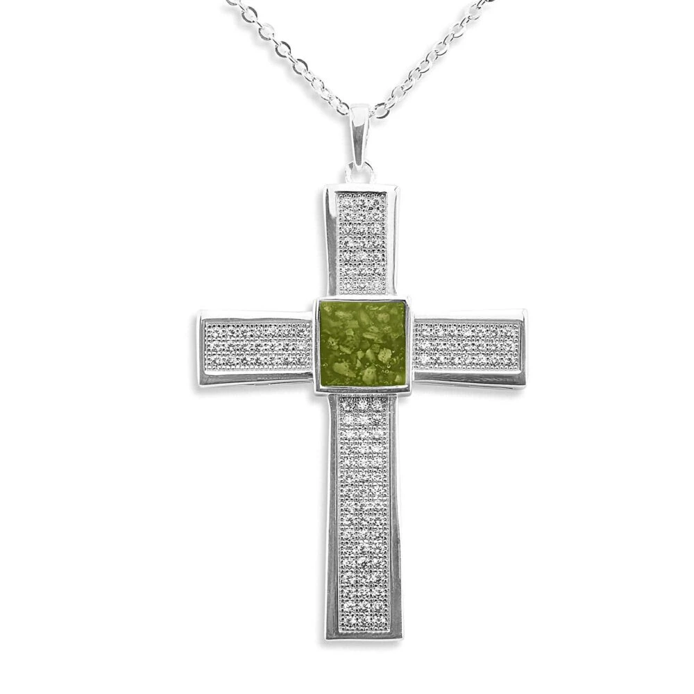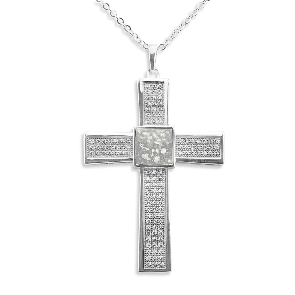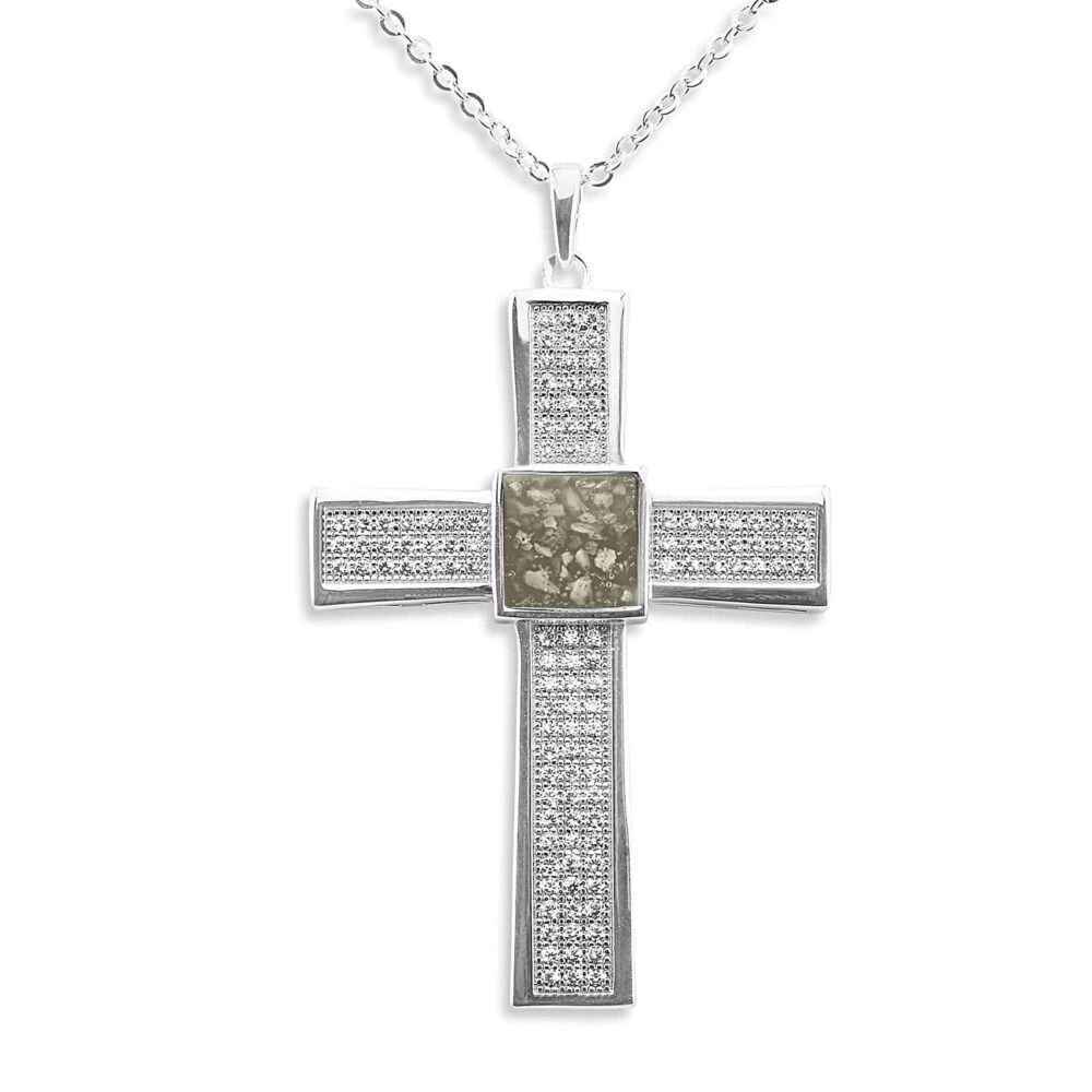 This large unisex oversized cross-shaped pendant has a small square central mount for the resin containing the cremated remains, with rows of tiny Fine crystals on the four arms. There is a choice of twelve colours of the resin and the Rhodium plating prevents any tarnishing of the Sterling Silver. Real diamond dust may be included in the mix and a 40cm chain with lobster clasp accompanies this lovely pendant.