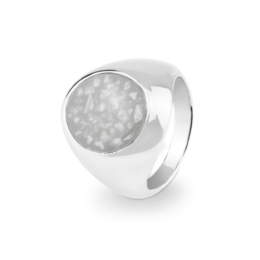 This gentleman’s sterling silver signet ring has a large circular mount to hold the resin containing the cremation ashes. This 925 Sterling Silver mens ring has a Rhodium coating to prevent tarnishing. This is a timeless, classic style, and the weight and solidity of this gent’s ring will always serve to remind the wearer of the close presence of their departed loved one.