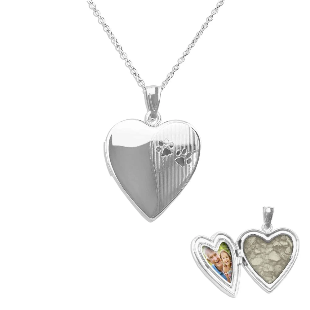 This ladies Sterling Silver heart-shaped locket is decorated with two paw prints and a matt and polished finish. Inside there is space for a photo and the resin containing the ashes. The resin comes in a choice of twelve colours and real diamond dust can be added. The locket hangs from a one-gram cable chain on a swing bale, is hallmarked, and has a protective Rhodium plating. A presentation box is included.