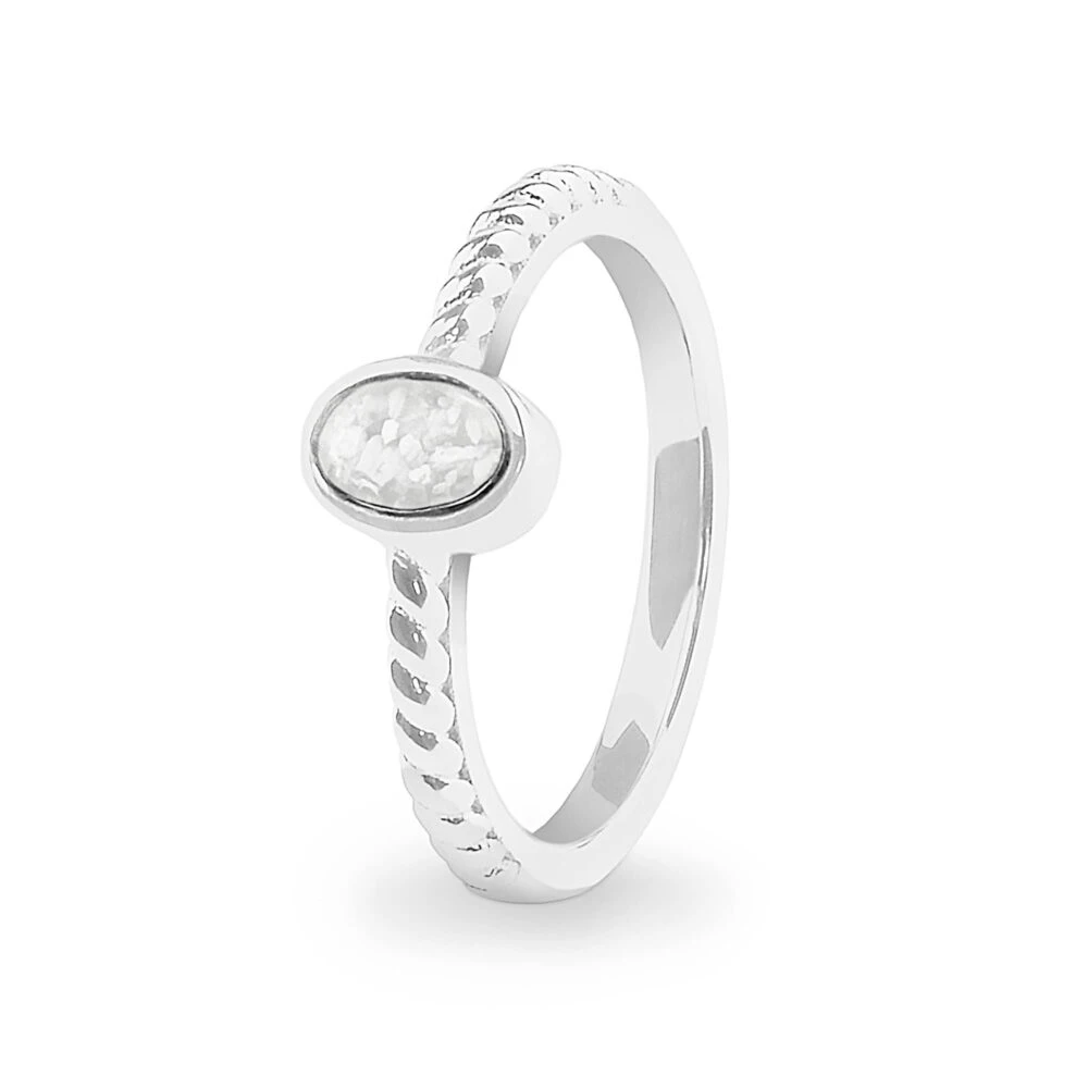 Our fine ring has a dainty plaited rope band and an oval mount to hold the special resin containing the cremation ashes. The resin is available in a choice of twelve colours and diamond dust can be included upon request. Crafted of 925 Sterling Silver or 9k Gold and it comes in a small gift box.