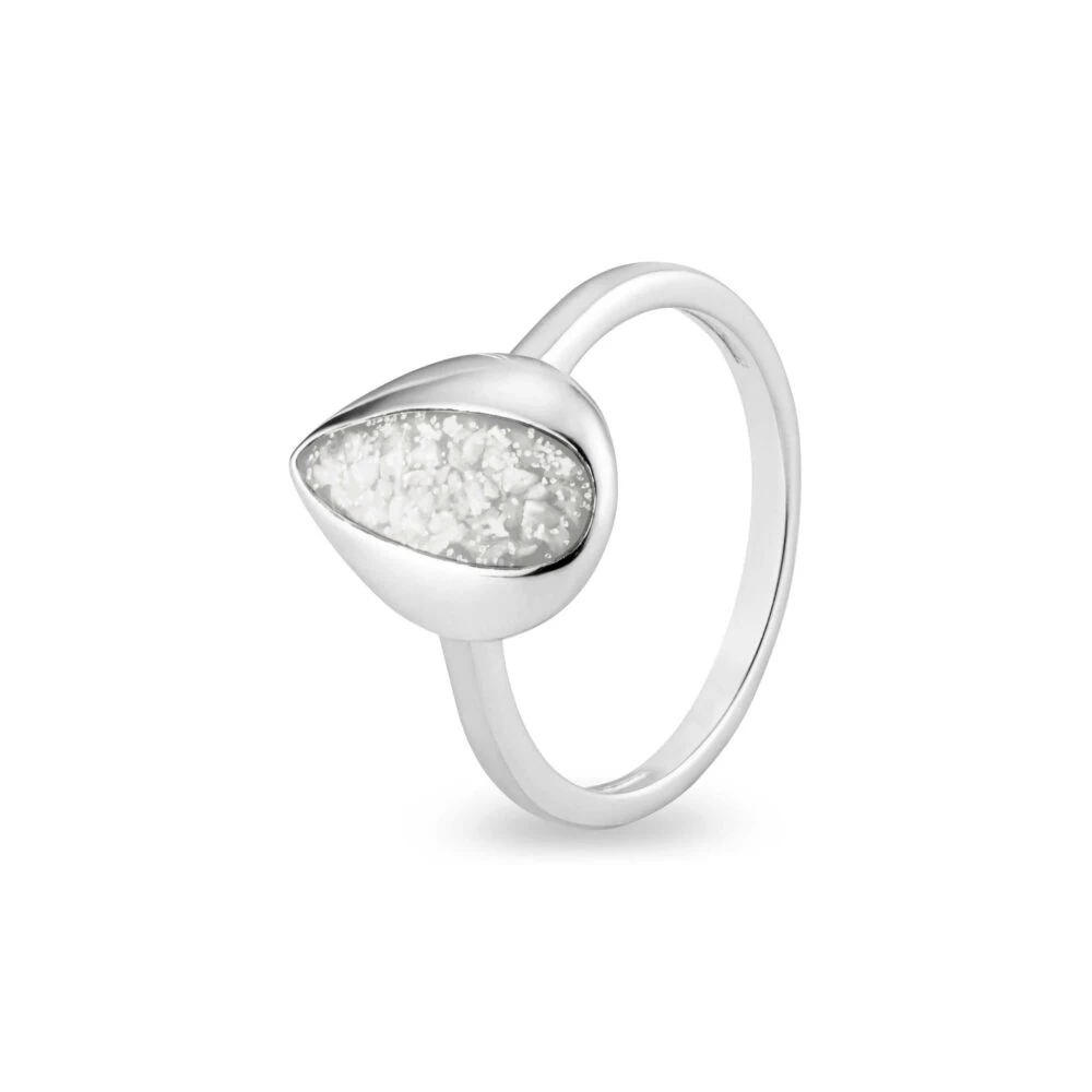 Our Rondure Teardrop Ring comes in Rhodium plated hallmarked 925 Sterling Silver and can be special ordered in Rose, Yellow, or White Gold. There are twelve different UV-resistant resin colours available to be set into the modern teardrop mount and real diamond dust can be included on request. The ring comes with a presentation box for safekeeping or gifting.
