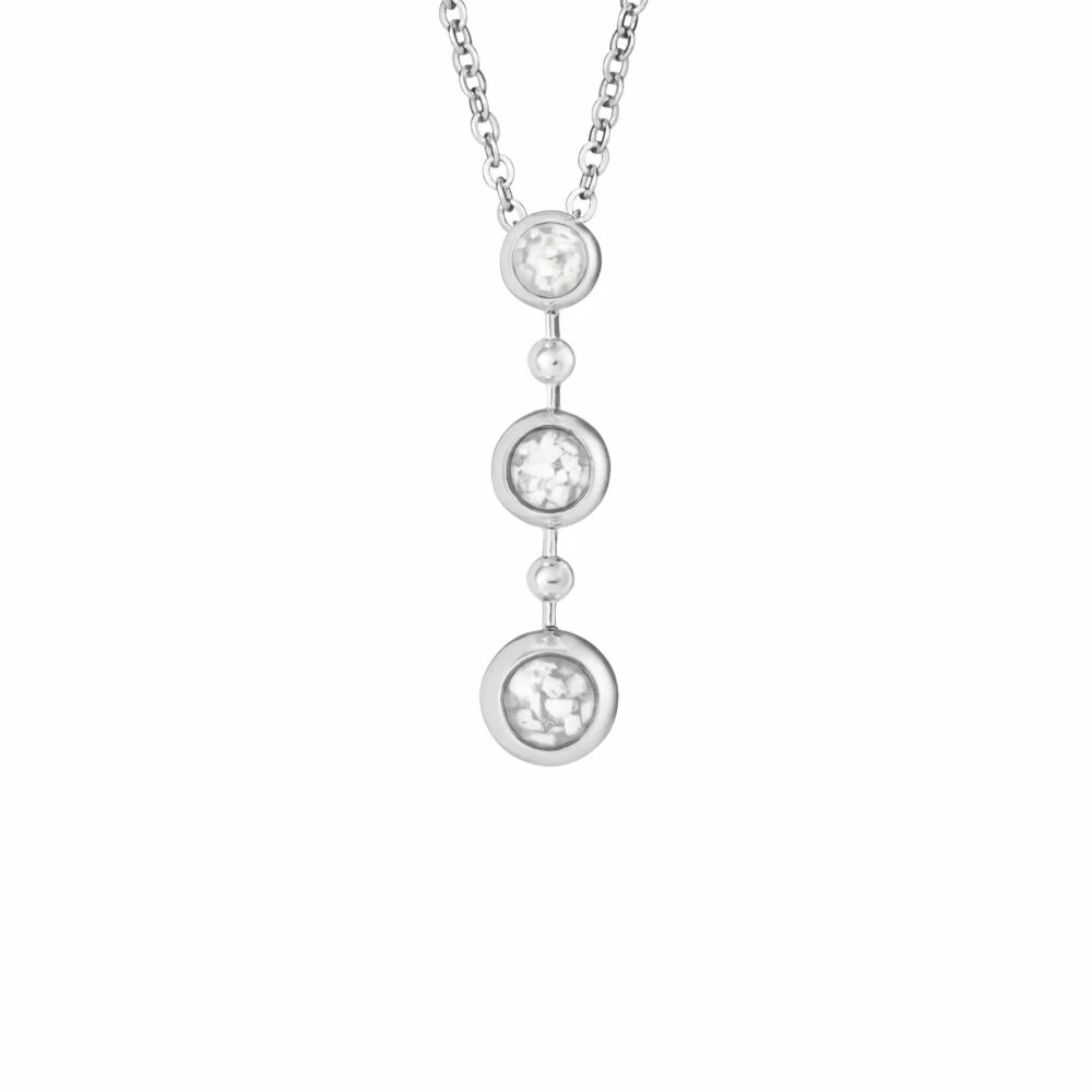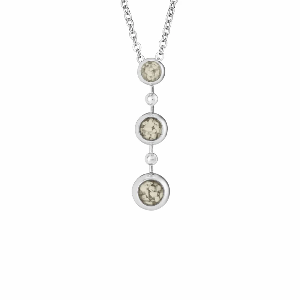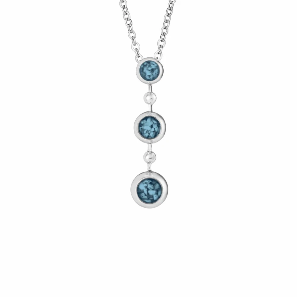 The Rondure Triple Drop necklace consists of three small circular mounts joined vertically. Each mount can be filled with a different colour resin and can include different ashes if desired. There are twelve resin colours and the option to include real diamond dust. The pendant comes is a presentation box and is available in hallmarked 925 Sterling Silver with Rhodium plating and by special order in Yellow, Rose, or White gold.