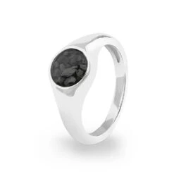The Ladies Sterling Silver Round Halo Memorial Ring with Fine Crystals has a plain mount to hold the coloured resin in which the cremated ashes are suspended. This ring has a narrow band, and on either side of the mount, there are numerous Fine Crystals set into the band. This ladies 925 Sterling Silver ladies ring has a Rhodium plating to prevent discolouration.