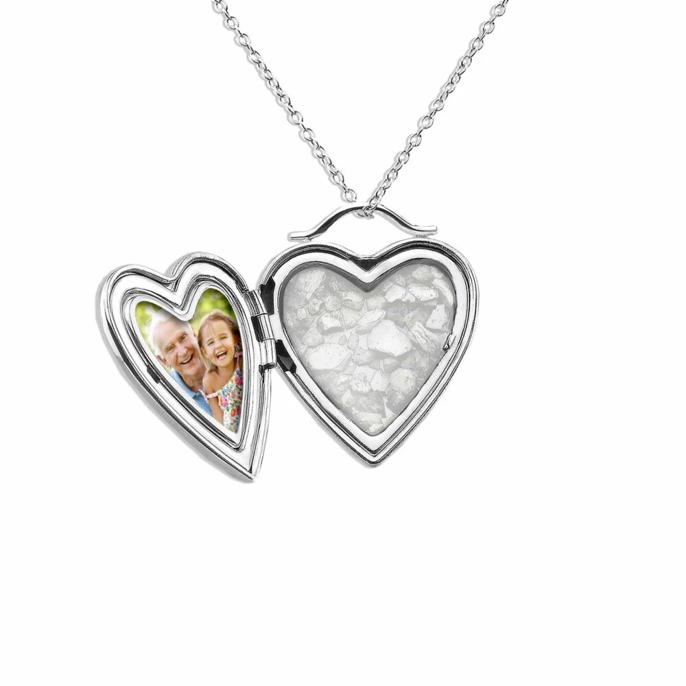 This ladies sterling silver heart-shaped locket has an elegant shining star engraved onto the front with a crystal set in the middle. It opens to reveal space on one side for a tiny photograph and in the other the resin containing the cremation ashes in a choice of twelve different colours is entered. The polished silver is Rhodium plated and hallmarked 925 on the rear. A lovely chain and a presentation box come included.