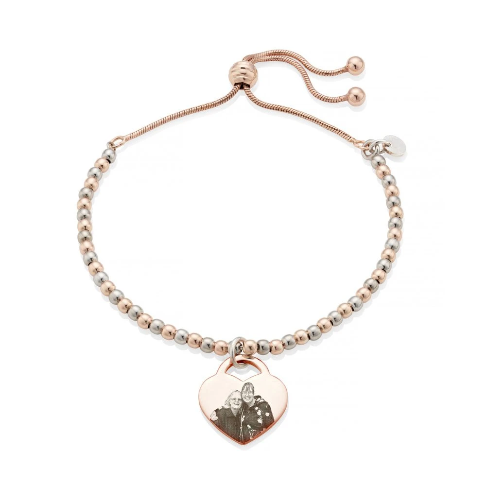 This item comes with a 19mm Sterling Silver or premium 18ct Rose Gold Vermeil heart charm, attached to a Sterling Silver & 18ct Rose Gold Vermeil bead slider bracelet. The bracelet is adjustable from 14cm at its smallest to 26cm at its widest setting.