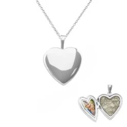 This hallmarked 925 Sterling Silver ladies locket bears the inscription of “Forever in my Heart”. Within, the resin with the cremation ashes, in a choice of twelve colours, is mounted on one side, and a small photo in the other. There is an optional diamond dust addition. The locket hangs from a swing bale on a one-gram cable chain and has a Rhodium plating. A presentation box is also included.