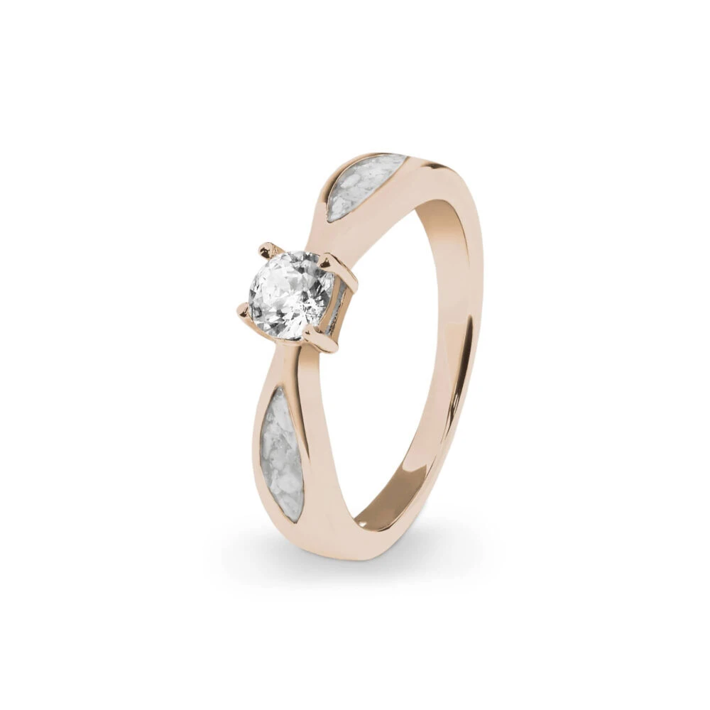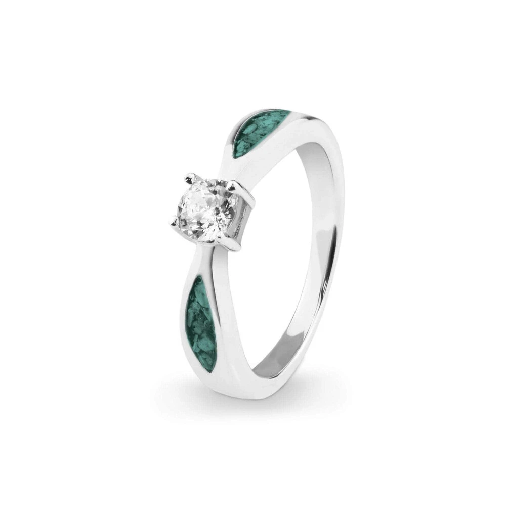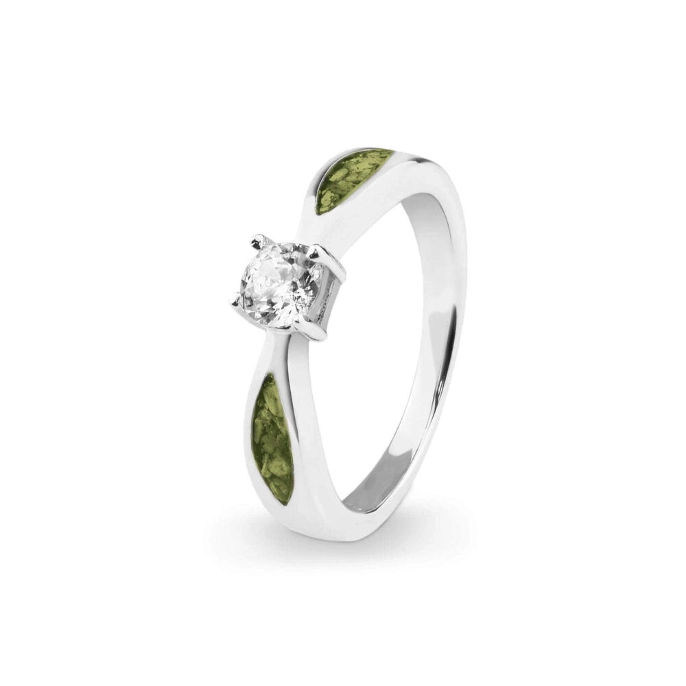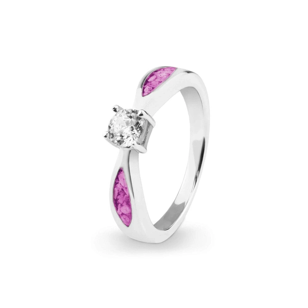 The Ladies Sterling Silver Solitaire Memorial Ring with Fine Crystal is a classically-styled ring with a single, large, shining lead crystal supported by four small heart-shaped mounts. On either side of this, there is a small ellipse-shaped groove cut into the band which houses the coloured resin containing the cremation ashes.