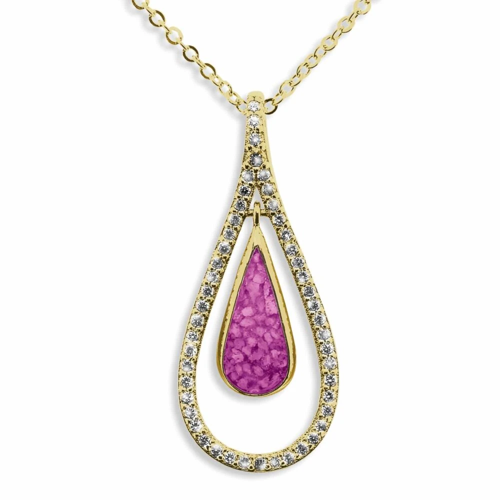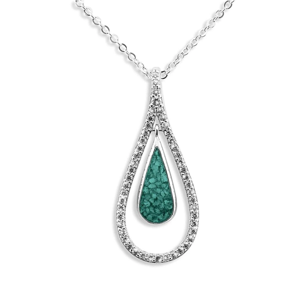 This teardrop shaped pendant is made with Fine crystals and set in sterling silver. The ashes and resin is held in the central compartment which is attached to the outer pendant and is able to swing back and forth. Choose the colour of the resin to encase the ashes of your loved one and why not add a sprinkle of diamond dust to add a subtle shimmer when the pendant is in bright sunlight.