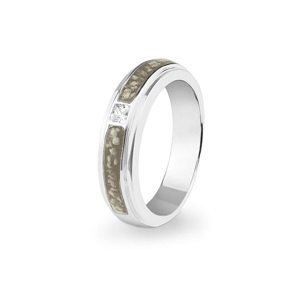 This unisex Remembrance memorial ashes ring has a single large square Fine Crystal set into the band and on either side, there is a narrow groove cut into the band for the coloured resin containing the cremation ashes. Diamond dust may be added to the mixture on request, and there are twelve distinct resin colours available. A Rhodium plating prevents tarnishing of this sterling silver ring.