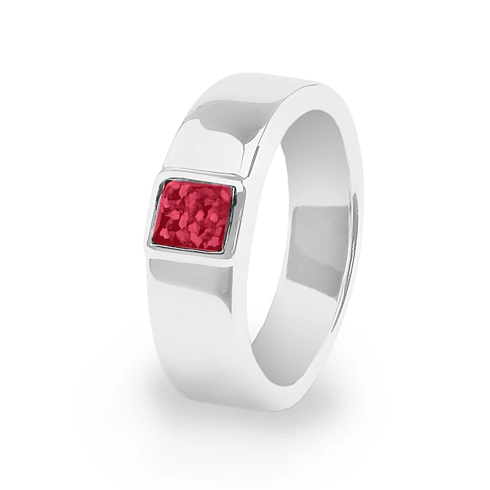 Unisex Strength ring has a small square mount set into the band. There are twelve resin colours available and the option of including diamond dust into the mix with the cremation ashes or hair. The ring is available in Sterling Silver or 9k Gold. The ring comes in a gift wrapped box.