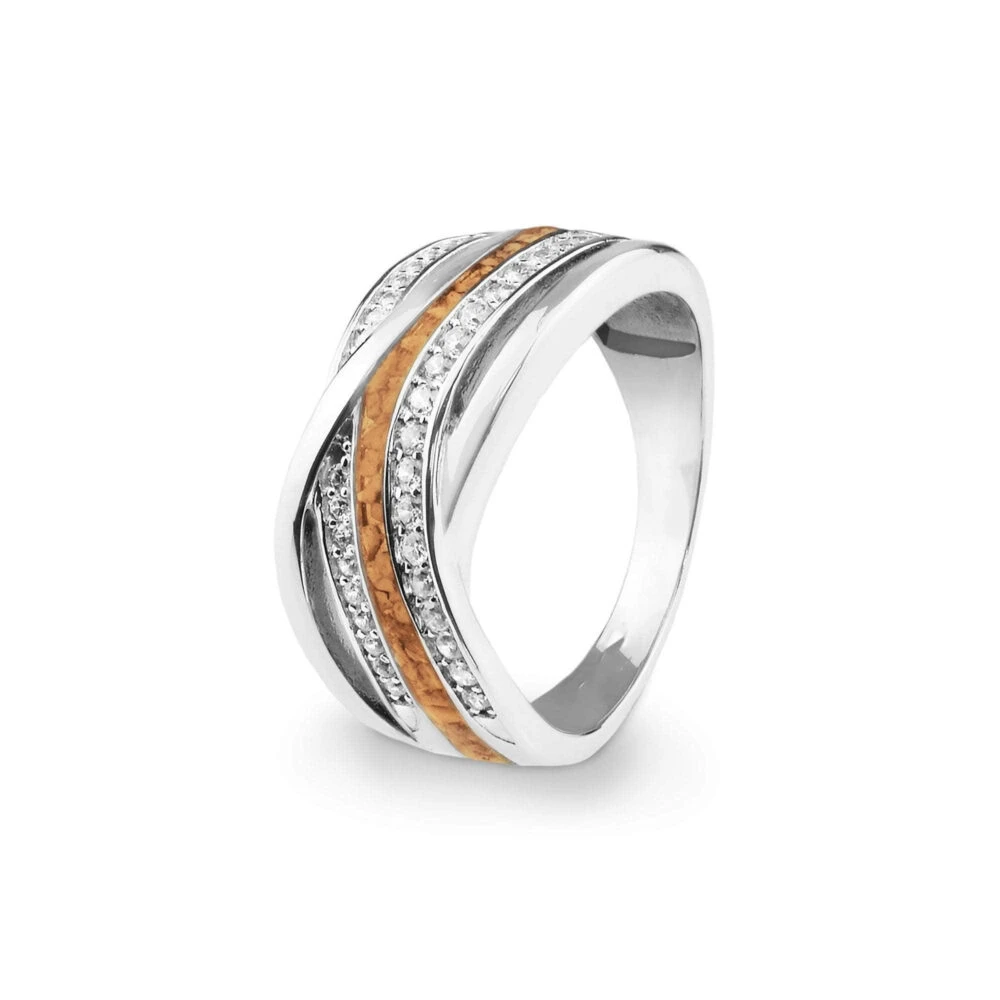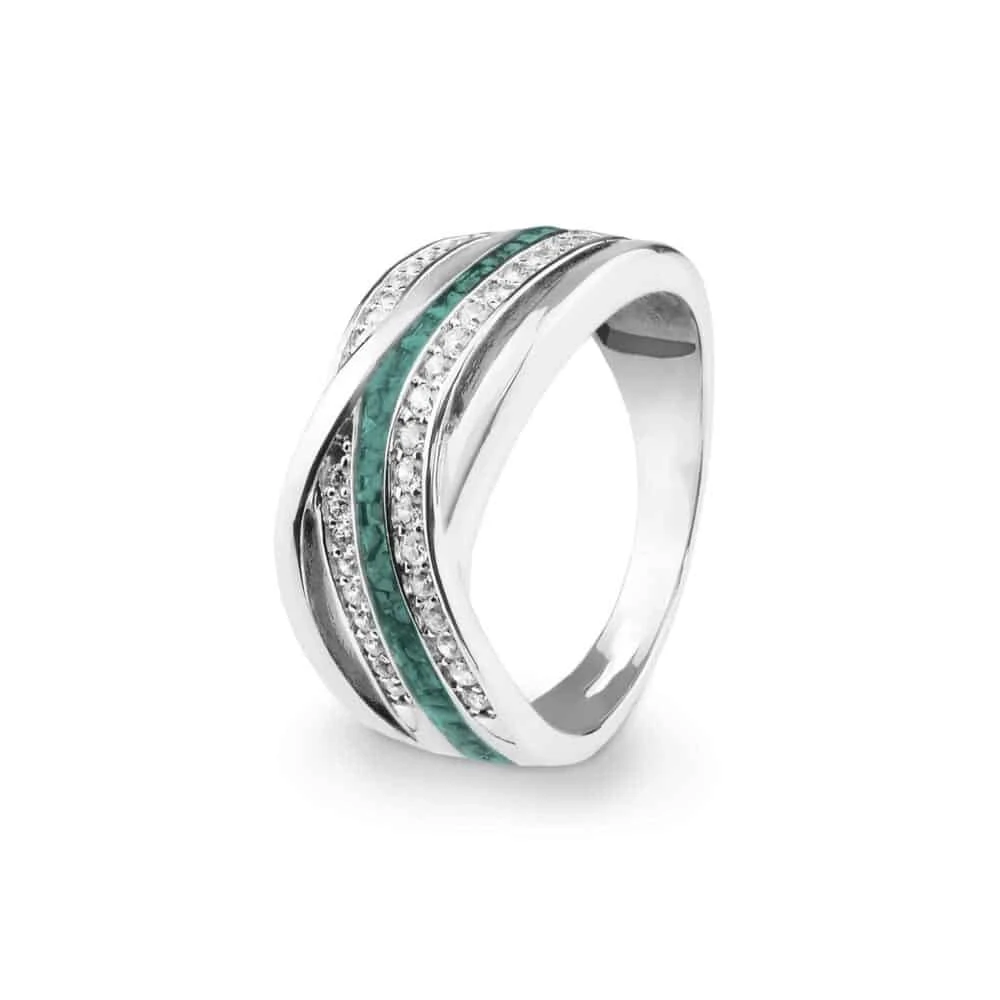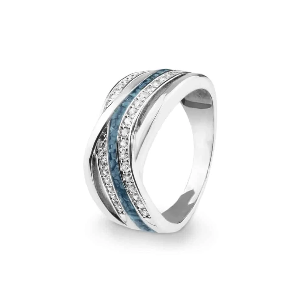 The Ladies Sterling Silver Waves Memorial Ring with Fine Crystals has an elegant modern style with four interwoven bands. Two of these are set with brilliant Fine Crystals, one is plain and the fourth holds the coloured resin containing the cremation ashes suspended within it. The 925 Sterling silver has a Rhodium plating which prevents tarnishing.